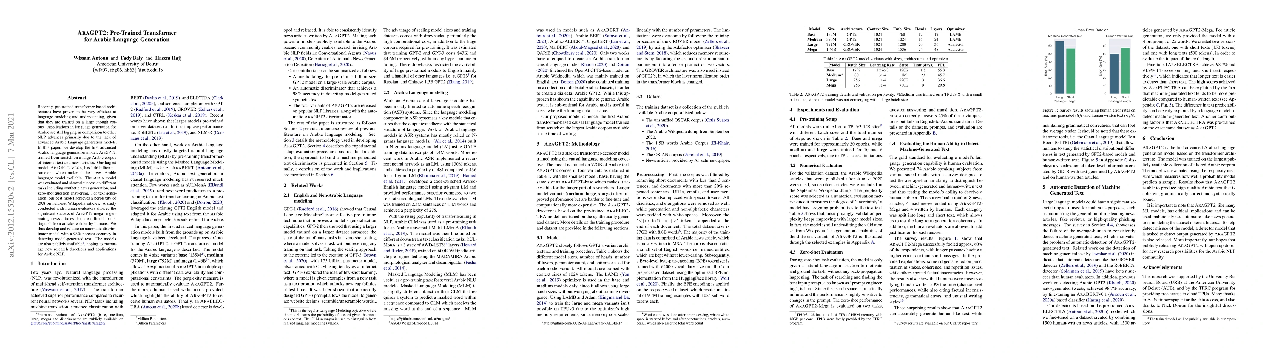 AraGPT2 introduces the first advanced Arabic language generation model, AraGPT2-mega, trained on a large corpus. It achieved notable success in tasks like synthetic news generation and zero-shot question answering, demonstrating the potential of large-scale language models for Arabic NLP.