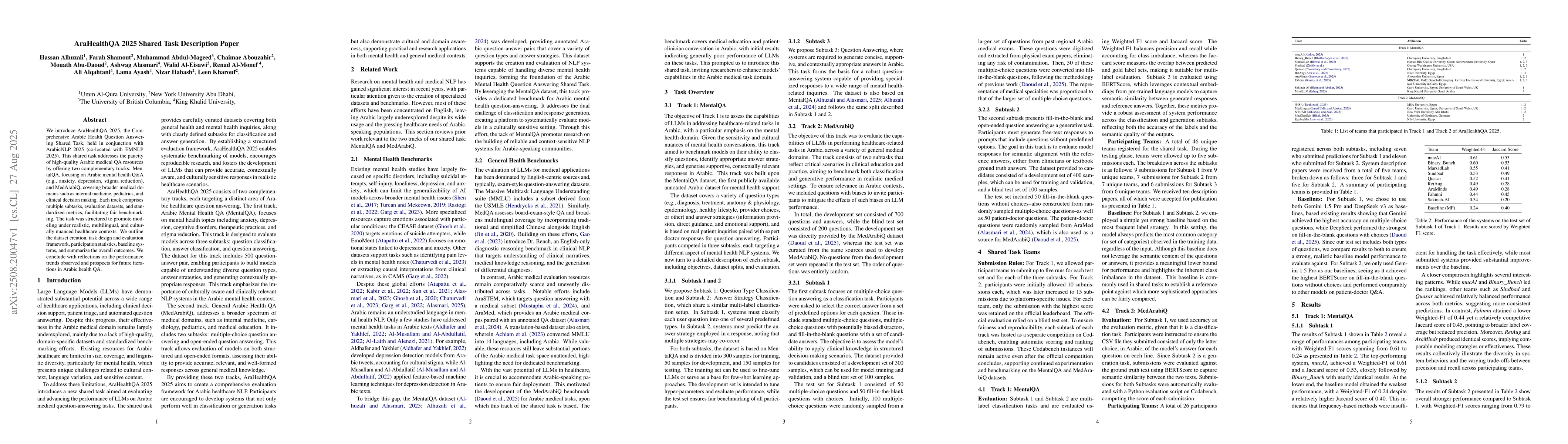 We introduce {AraHealthQA 2025}, the {Comprehensive Arabic Health Question Answering Shared Task}, held in conjunction with {ArabicNLP 2025} (co-located with EMNLP 2025). This shared task addresses the paucity of high-quality Arabic medical QA resources by offering two complementary tracks: {MentalQA}, focusing on Arabic mental health Q\&A (e.g., anxiety, depression, stigma reduction), and {MedArabiQ}, covering broader medical domains such as internal medicine, pediatrics, and clinical decision making. Each track comprises multiple subtasks, evaluation datasets, and standardized metrics, facilitating fair benchmarking. The task was structured to promote modeling under realistic, multilingual, and culturally nuanced healthcare contexts. We outline the dataset creation, task design and evaluation framework, participation statistics, baseline systems, and summarize the overall outcomes. We conclude with reflections on the performance trends observed and prospects for future iterations in Arabic health QA.