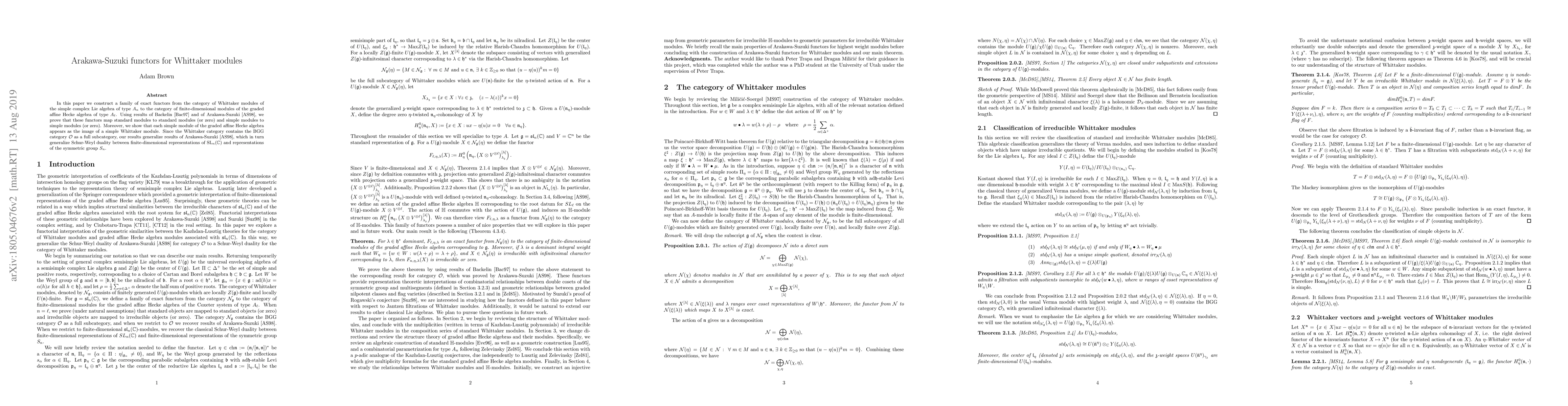 This paper constructs exact functors from Whittaker modules of $A_n$ to finite-dimensional modules of the graded affine Hecke algebra of $A_\ell$, proving they map standard and simple modules to corresponding types. The results generalize Arakawa-Suzuki's findings and extend beyond the BGG category $\mathcal{O}$.