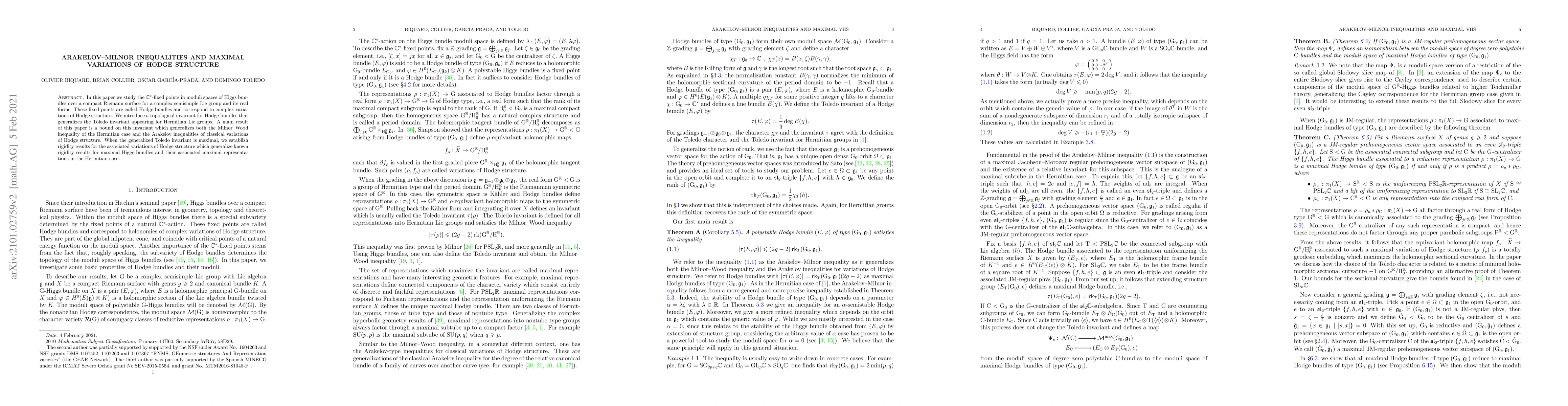 In this paper we study the $\mathbb{C}^*$-fixed points in moduli spaces of Higgs bundles over a compact Riemann surface for a complex semisimple Lie group and its real forms. These fixed points are called Hodge bundles and correspond to complex variations of Hodge structure. We introduce a topological invariant for Hodge bundles that generalizes the Toledo invariant appearing for Hermitian Lie groups. A main result of this paper is a bound on this invariant which generalizes both the Milnor-Wood inequality of the Hermitian case and the Arakelov inequalities of classical variations of Hodge structure. When the generalized Toledo invariant is maximal, we establish rigidity results for the associated variations of Hodge structure which generalize known rigidity results for maximal Higgs bundles and their associated maximal representations in the Hermitian case.