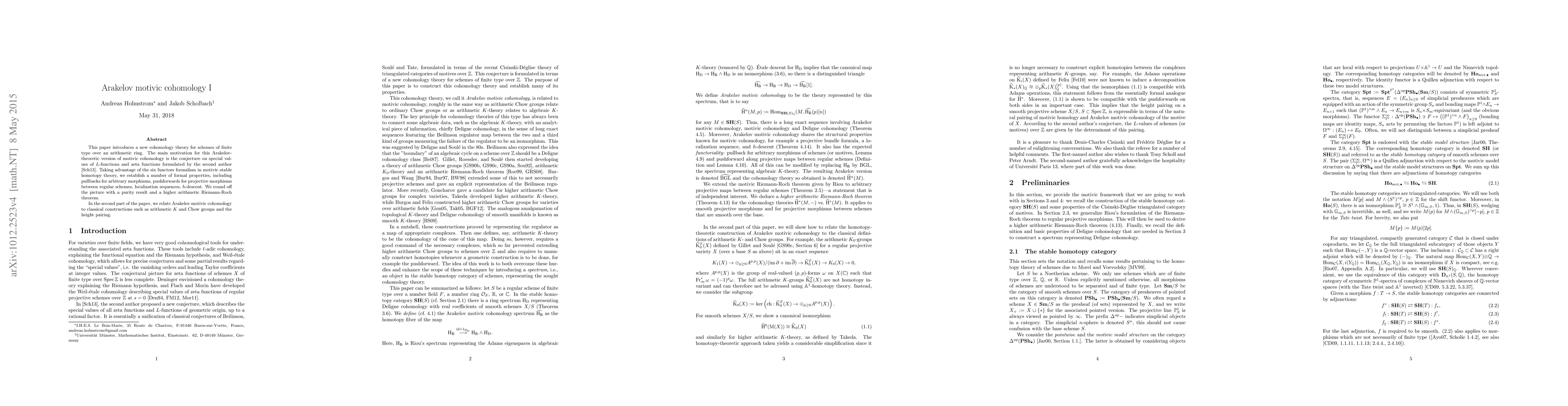 This paper introduces a new cohomology theory for schemes of finite type over an arithmetic ring. The main motivation for this Arakelov-theoretic version of motivic cohomology is the conjecture on special values of $L$-functions and zeta functions formulated by the second author. Taking advantage of the six functors formalism in motivic stable homotopy theory, we establish a number of formal properties, including pullbacks for arbitrary morphisms, pushforwards for projective morphisms between regular schemes, localization sequences, $h$-descent. We round off the picture with a purity result and a higher arithmetic Riemann-Roch theorem.
