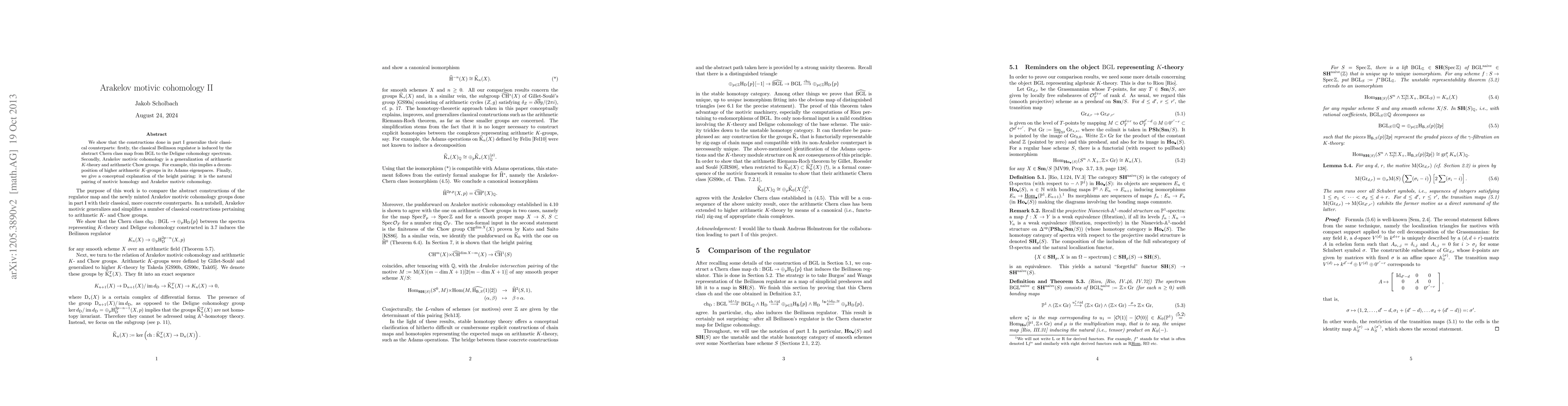 We show that the constructions done in part I generalize their classical counterparts: firstly, the classical Beilinson regulator is induced by the abstract Chern class map from $BGL$ to the Deligne cohomology spectrum. Secondly, Arakelov motivic cohomology is a generalization of arithmetic $K$-theory and arithmetic Chow groups. Finally, we give a conceptual explanation of the height pairing: it is given by the natural pairing of motivic homology and Arakelov motivic cohomology.