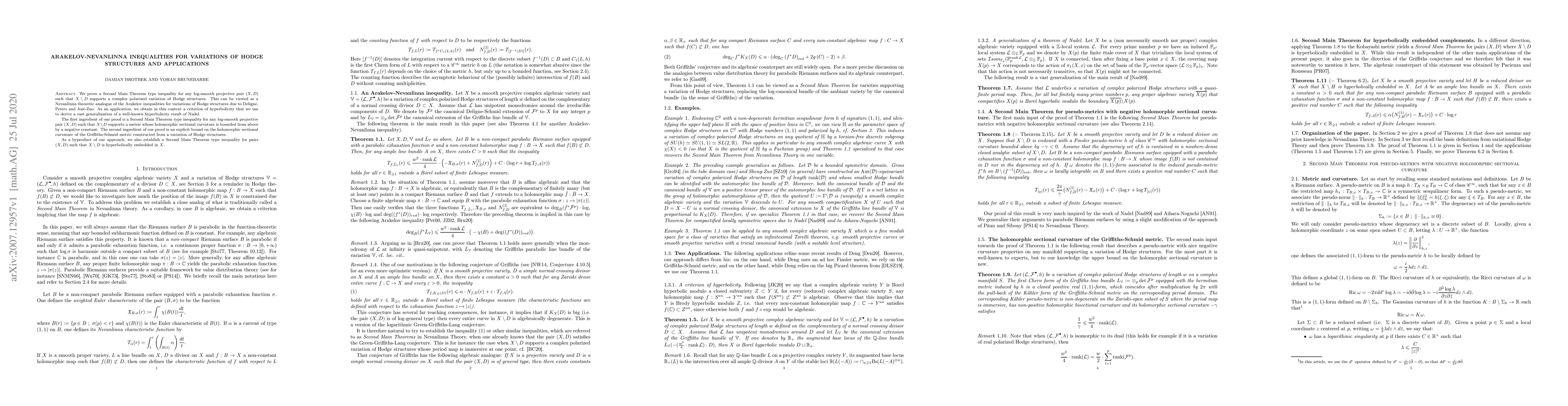 This paper proves a Second Main Theorem type inequality for log-smooth projective pairs supporting complex polarized variations of Hodge structures, establishing a Nevanlinna-theoretic analogue of Arakelov inequalities. The result also provides a hyperbolicity criterion and generalizes Nadel's hyperbolicity result.