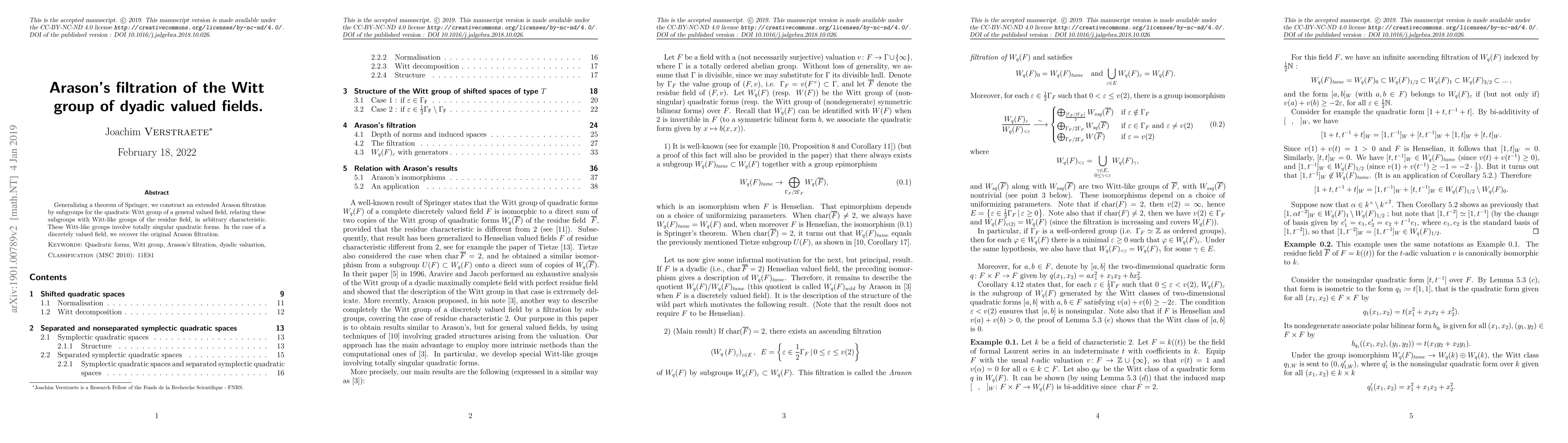 This paper constructs an extended Arason filtration for the Witt group of quadratic forms in dyadic valued fields, generalizing Springer's theorem and linking these subgroups to Witt-like groups of the residue field, including those involving totally singular quadratic forms. For discretely valued fields, it recovers the original Arason filtration.