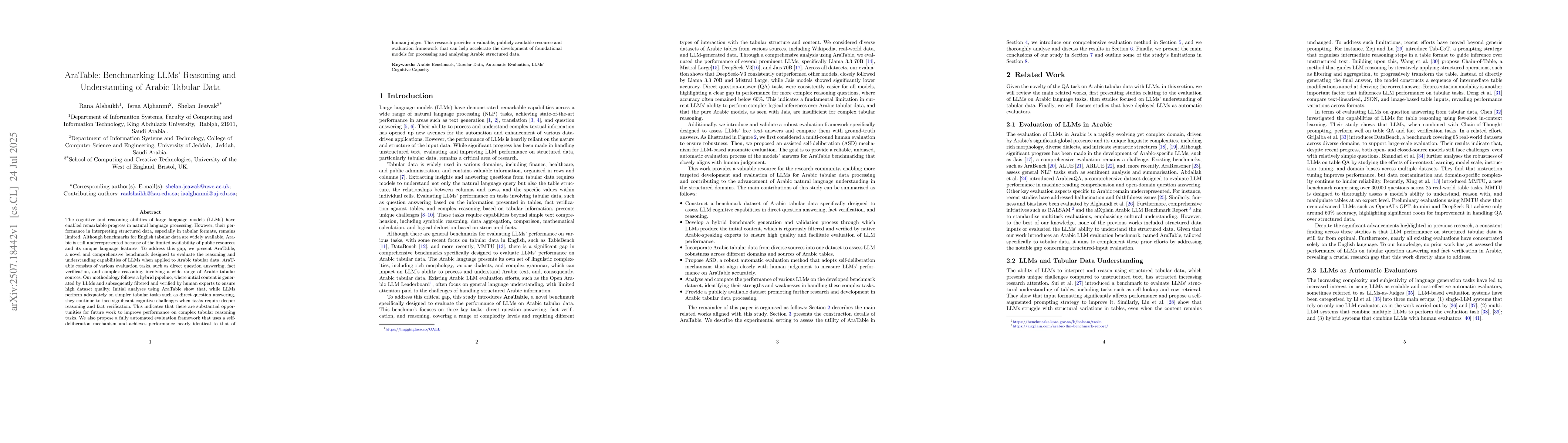 AraTable, a benchmark for evaluating LLMs on Arabic tabular data, was developed with tasks including direct question answering, reasoning, and fact verification. It involves a hybrid pipeline with LLMs generating initial content, followed by human expert verification for high dataset quality.