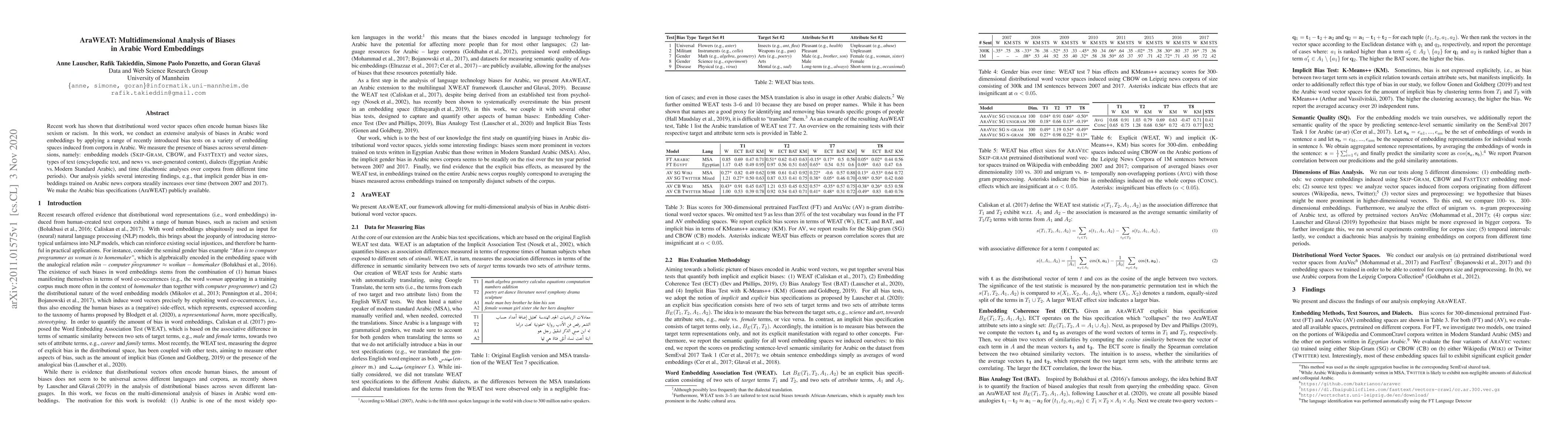 This paper analyzes biases in Arabic word embeddings across various models and contexts, revealing increasing gender bias in news corpora over time. The study uses AraWEAT, a new tool, to publicly share findings on biases related to embedding models, text types, dialects, and temporal changes.