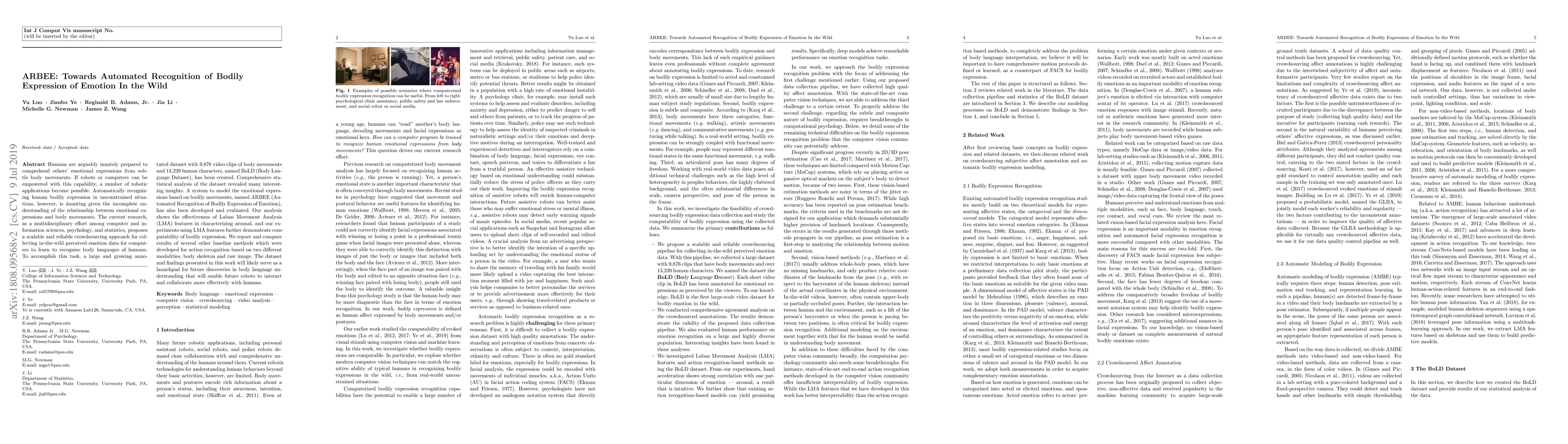 Humans are arguably innately prepared to comprehend others' emotional expressions from subtle body movements. If robots or computers can be empowered with this capability, a number of robotic applications become possible. Automatically recognizing human bodily expression in unconstrained situations, however, is daunting given the incomplete understanding of the relationship between emotional expressions and body movements. The current research, as a multidisciplinary effort among computer and information sciences, psychology, and statistics, proposes a scalable and reliable crowdsourcing approach for collecting in-the-wild perceived emotion data for computers to learn to recognize body languages of humans. To accomplish this task, a large and growing annotated dataset with 9,876 video clips of body movements and 13,239 human characters, named BoLD (Body Language Dataset), has been created. Comprehensive statistical analysis of the dataset revealed many interesting insights. A system to model the emotional expressions based on bodily movements, named ARBEE (Automated Recognition of Bodily Expression of Emotion), has also been developed and evaluated. Our analysis shows the effectiveness of Laban Movement Analysis (LMA) features in characterizing arousal, and our experiments using LMA features further demonstrate computability of bodily expression. We report and compare results of several other baseline methods which were developed for action recognition based on two different modalities, body skeleton, and raw image. The dataset and findings presented in this work will likely serve as a launchpad for future discoveries in body language understanding that will enable future robots to interact and collaborate more effectively with humans.