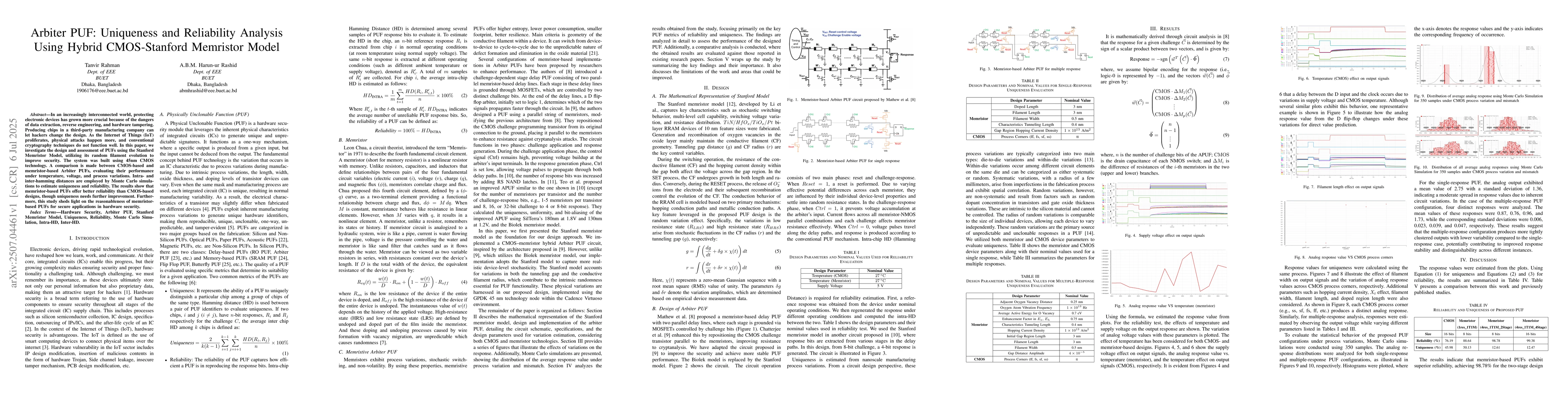 In an increasingly interconnected world, protecting electronic devices has grown more crucial because of the dangers of data extraction, reverse engineering, and hardware tampering. Producing chips in a third-party manufacturing company can let hackers change the design. As the Internet of Things (IoT) proliferates, physical attacks happen more, and conventional cryptography techniques do not function well. In this paper, we investigate the design and assessment of PUFs using the Stanford Memristor Model, utilizing its random filament evolution to improve security. The system was built using 45nm CMOS technology. A comparison is made between CMOS-based and memristor-based Arbiter PUFs, evaluating their performance under temperature, voltage, and process variations. Intra- and inter-hamming distances are employed by Monte Carlo simulations to estimate uniqueness and reliability. The results show that memristor-based PUFs offer better reliability than CMOS-based designs, though uniqueness needs further improvement. Furthermore, this study sheds light on the reasonableness of memristor-based PUFs for secure applications in hardware security.