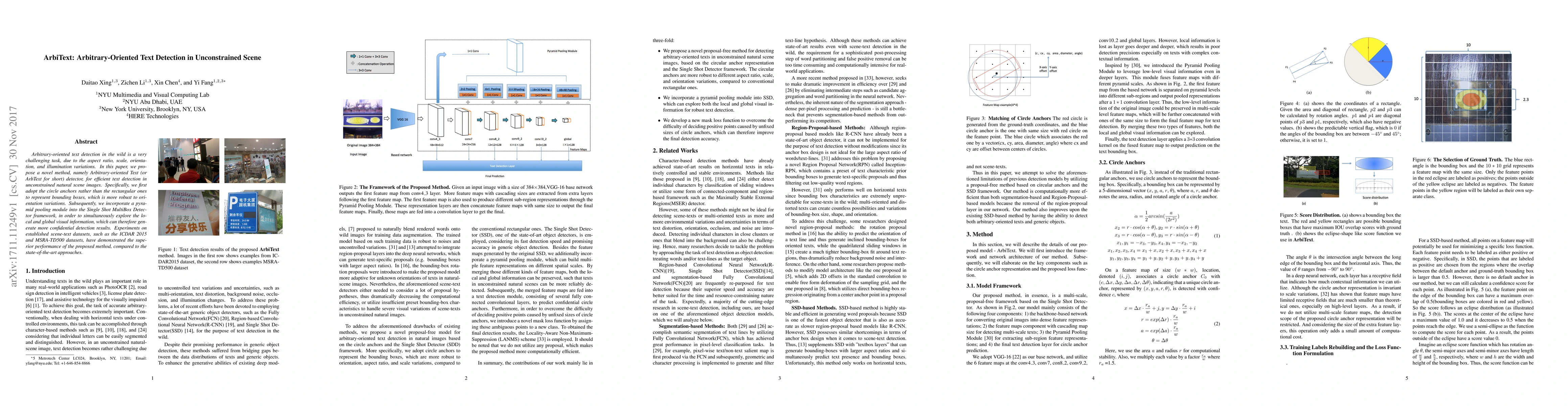 This paper proposes ArbText, a novel method for detecting arbitrary-oriented text in natural scenes using circle anchors and a pyramid pooling module within the Single Shot MultiBox Detector framework, achieving superior performance over state-of-the-art approaches on datasets like ICDAR 2015 and MSRA-TD500.