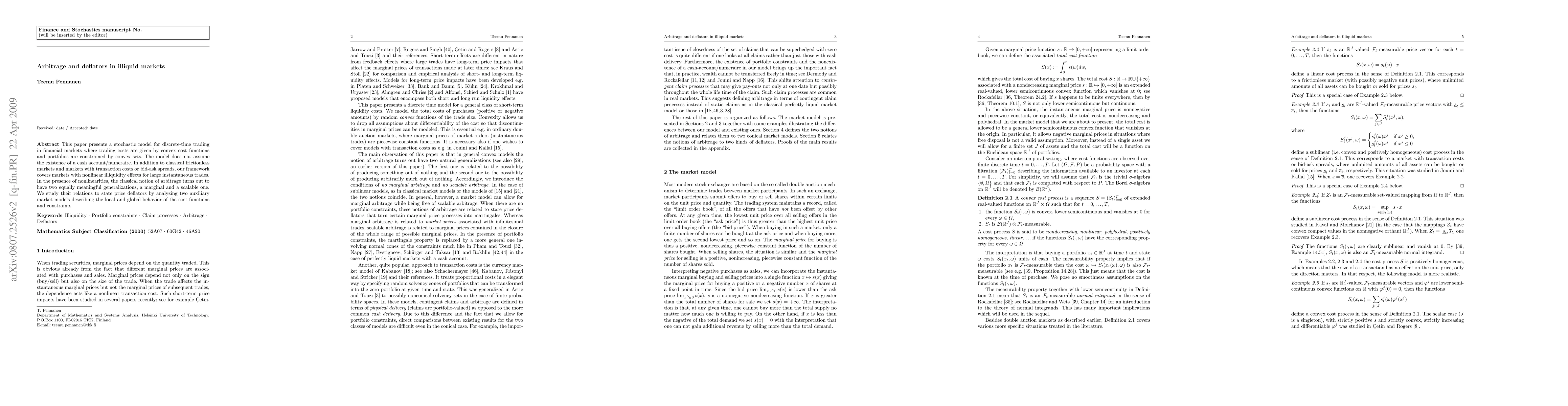 This paper develops a stochastic model for trading in illiquid markets with nonlinear transaction costs and constraints, exploring two types of arbitrage in the absence of a cash account. It examines the relationship between these arbitrages and state price deflators through auxiliary market models.