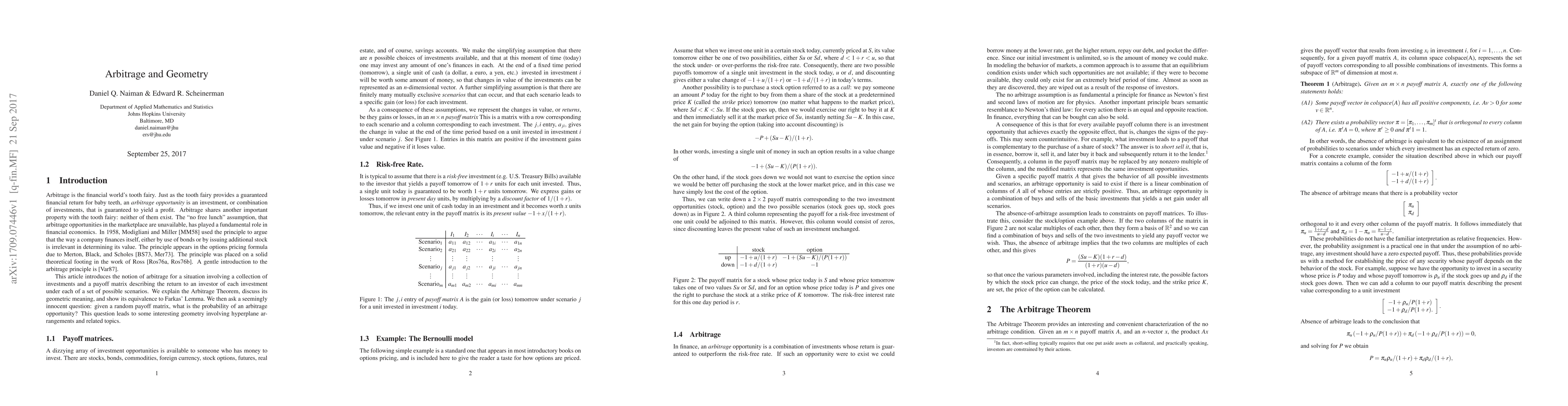This article introduces the notion of arbitrage for a situation involving a collection of investments and a payoff matrix describing the return to an investor of each investment under each of a set of possible scenarios. We explain the Arbitrage Theorem, discuss its geometric meaning, and show its equivalence to Farkas' Lemma. We then ask a seemingly innocent question: given a random payoff matrix, what is the probability of an arbitrage opportunity? This question leads to some interesting geometry involving hyperplane arrangements and related topics.