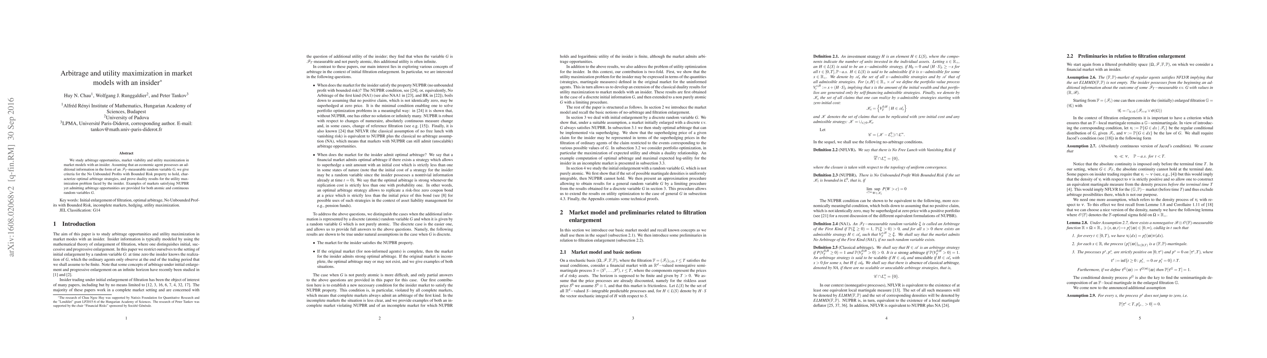 This paper investigates arbitrage opportunities, market viability, and utility maximization in market models with an insider who has initial privileged information. It establishes criteria for the No Unbounded Profits with Bounded Risk property, characterizes optimal arbitrage strategies, and proves duality results for the insider's utility maximization problem.