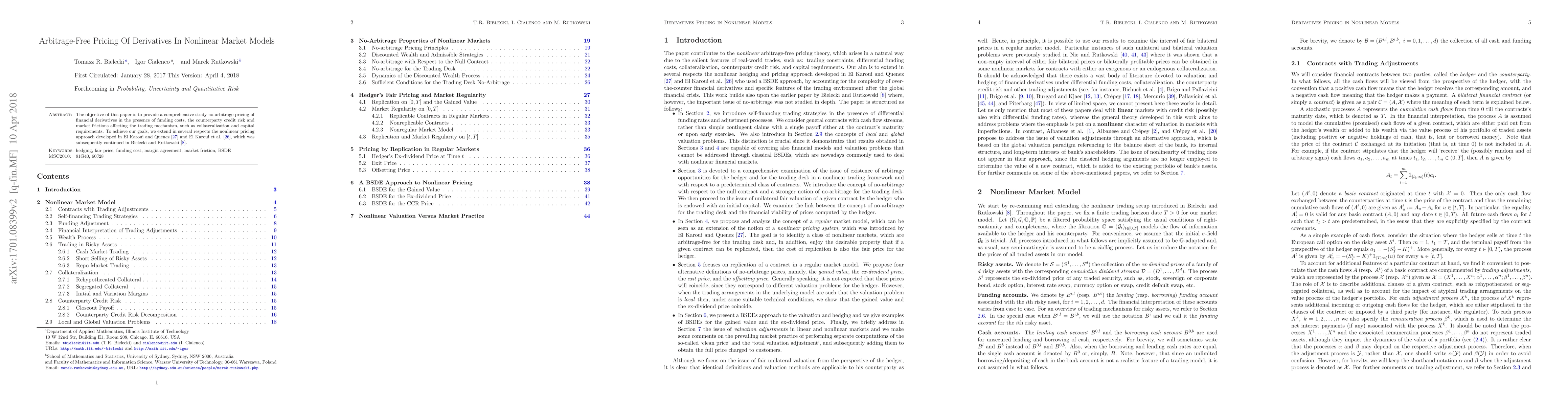 This paper explores the no-arbitrage pricing of financial derivatives in nonlinear market models, incorporating funding costs, counterparty credit risk, and market frictions like collateralization and capital requirements. It extends the nonlinear pricing approach developed by El Karoui and Quenez, and subsequent work by Bielecki and Rutkowski.