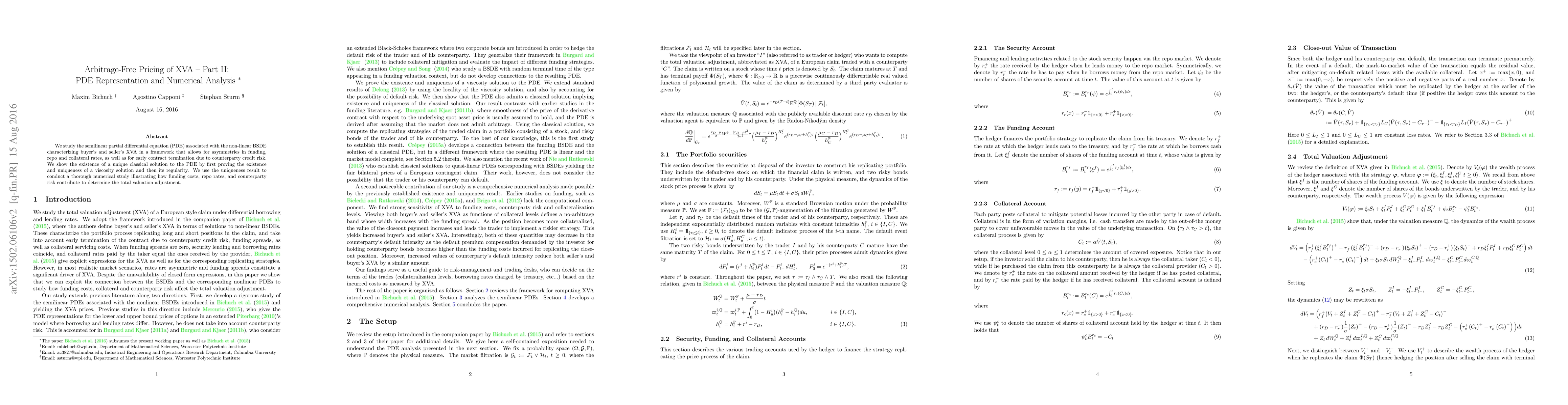 This paper investigates the semilinear PDE linked to the non-linear BSDE for XVA pricing, demonstrating the existence and uniqueness of a classical solution via viscosity solution and regularity proofs. It also conducts a numerical analysis to show how funding costs, repo rates, and credit risk impact the valuation adjustment.