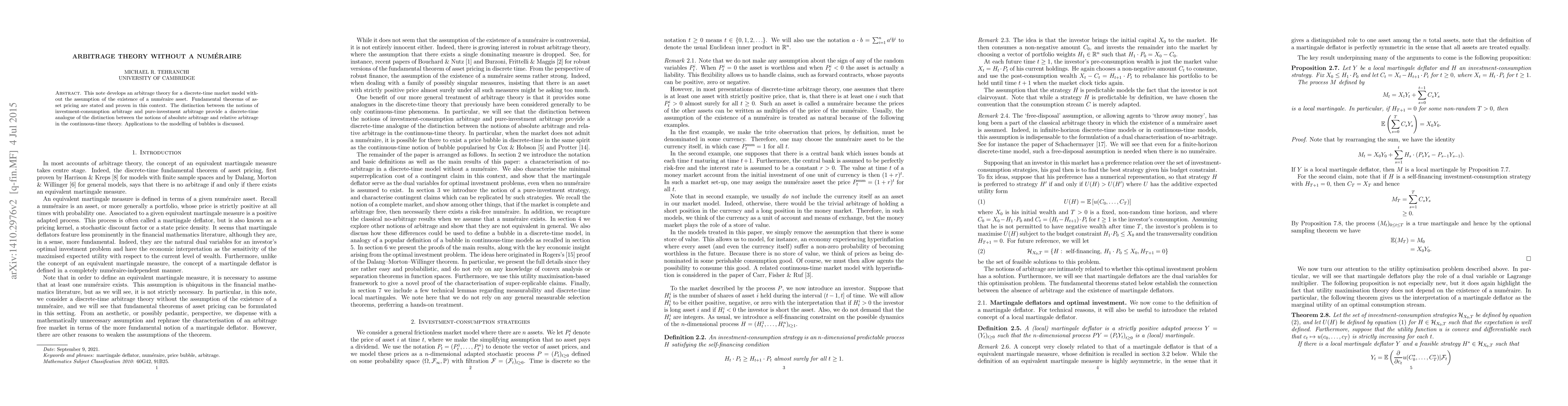 This note develops an arbitrage theory for a discrete-time market model without the assumption of the existence of a num\'eraire asset. Fundamental theorems of asset pricing are stated and proven in this context. The distinction between the notions of investment-consumption arbitrage and pure-investment arbitrage provide a discrete-time analogue of the distinction between the notions of absolute arbitrage and relative arbitrage in the continuous-time theory. Applications to the modelling of bubbles is discussed.