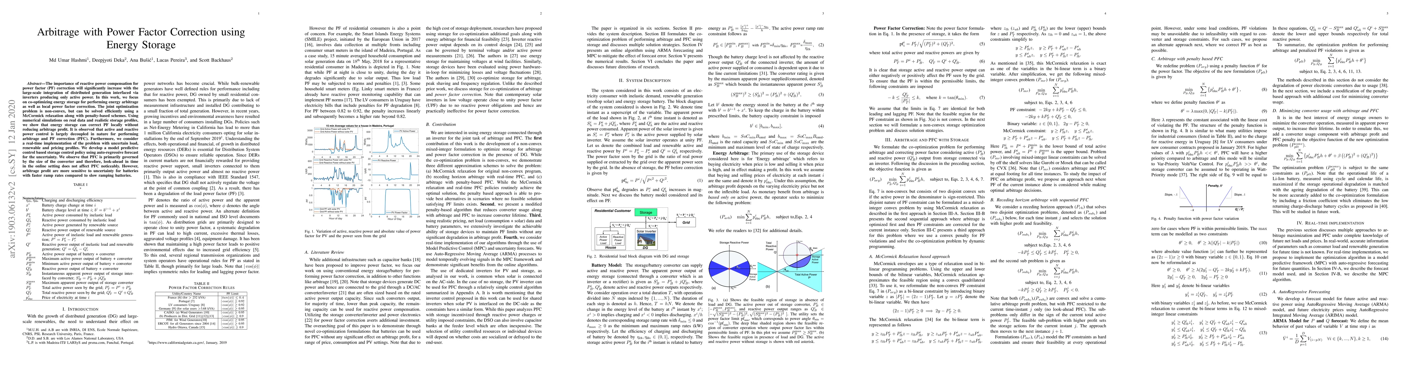 This paper explores optimizing energy storage for both energy arbitrage and local power factor correction in systems with distributed generation. It employs a non-convex optimization approach using McCormick relaxation and shows that energy storage can correct power factor without compromising arbitrage profits.