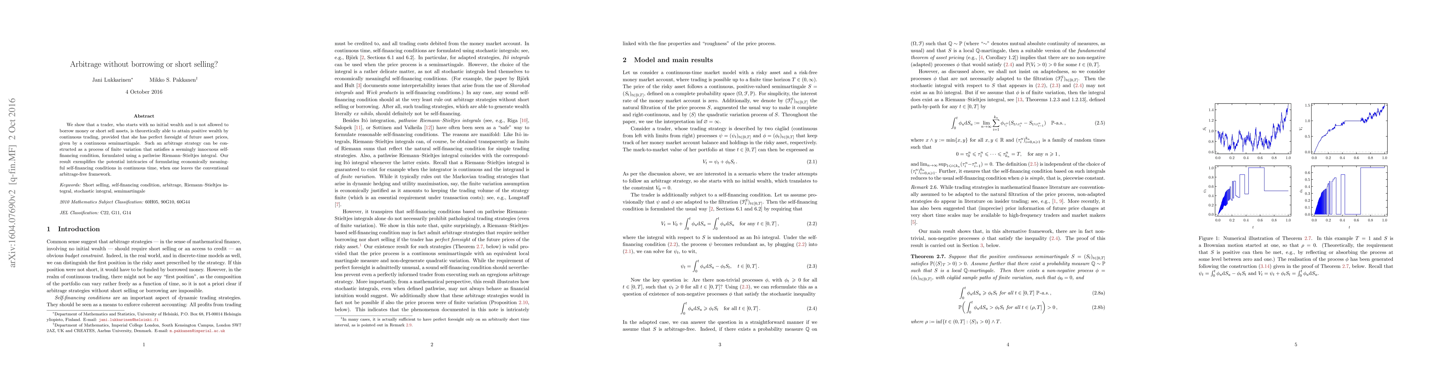This paper demonstrates that a trader with perfect foresight can achieve positive wealth through continuous trading, even without borrowing or short selling, by constructing a self-financing arbitrage strategy using a pathwise Riemann-Stieltjes integral. It highlights the complexities of defining self-financing conditions in continuous time outside the traditional arbitrage-free framework.