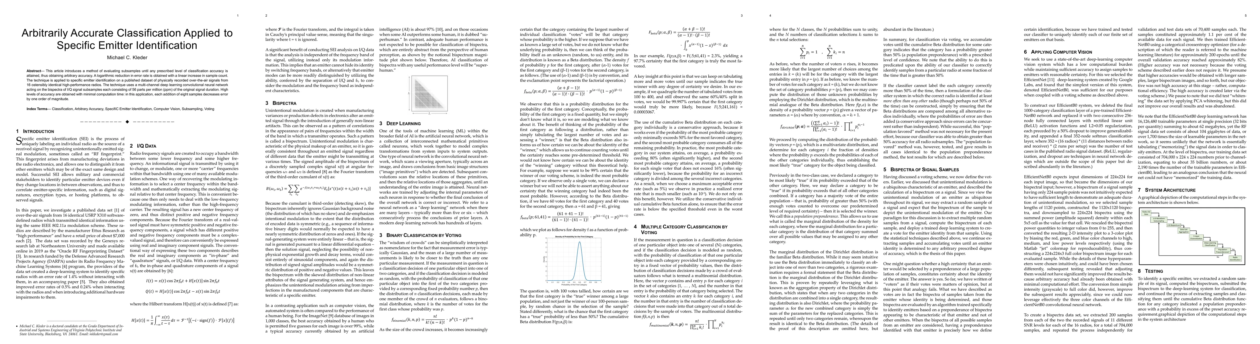 This article introduces a method of evaluating subsamples until any prescribed level of classification accuracy is attained, thus obtaining arbitrary accuracy. A logarithmic reduction in error rate is obtained with a linear increase in sample count. The technique is applied to specific emitter identification on a published dataset of physically recorded over-the-air signals from 16 ostensibly identical high-performance radios. The technique uses a multi-channel deep learning convolutional neural network acting on the bispectra of I/Q signal subsamples each consisting of 56 parts per million (ppm) of the original signal duration. High levels of accuracy are obtained with minimal computation time: in this application, each addition of eight samples decreases error by one order of magnitude.