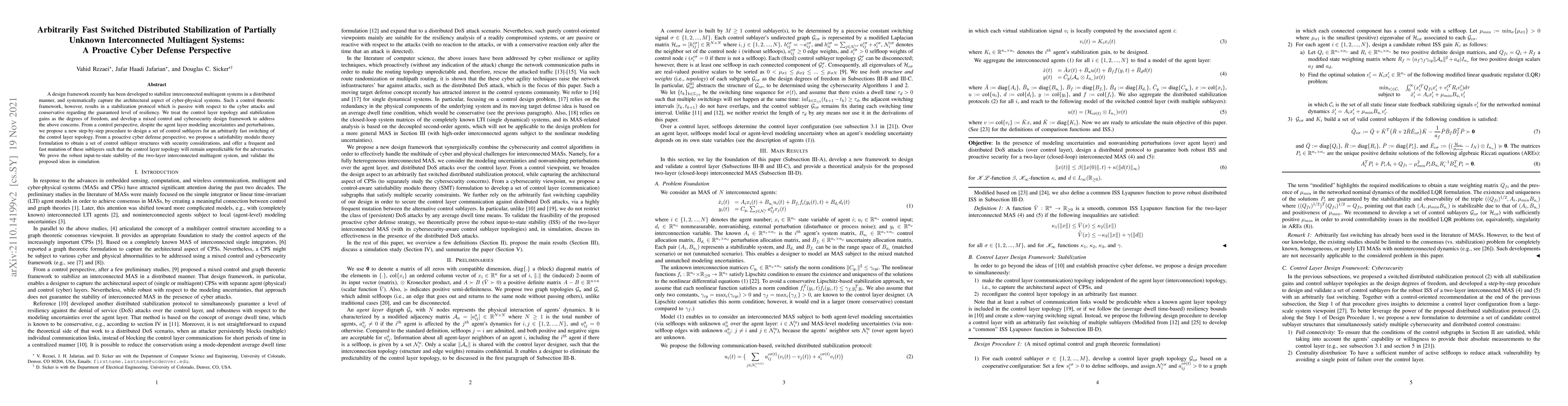 A design framework recently has been developed to stabilize interconnected multiagent systems in a distributed manner, and systematically capture the architectural aspect of cyber-physical systems. Such a control theoretic framework, however, results in a stabilization protocol which is passive with respect to the cyber attacks and conservative regarding the guaranteed level of resiliency. We treat the control layer topology and stabilization gains as the degrees of freedom, and develop a mixed control and cybersecurity design framework to address the above concerns. From a control perspective, despite the agent layer modeling uncertainties and perturbations, we propose a new step-by-step procedure to design a set of control sublayers for an arbitrarily fast switching of the control layer topology. From a proactive cyber defense perspective, we propose a satisfiability modulo theory formulation to obtain a set of control sublayer structures with security considerations, and offer a frequent and fast mutation of these sublayers such that the control layer topology will remain unpredictable for the adversaries. We prove the robust input-to-state stability of the two-layer interconnected multiagent system, and validate the proposed ideas in simulation.