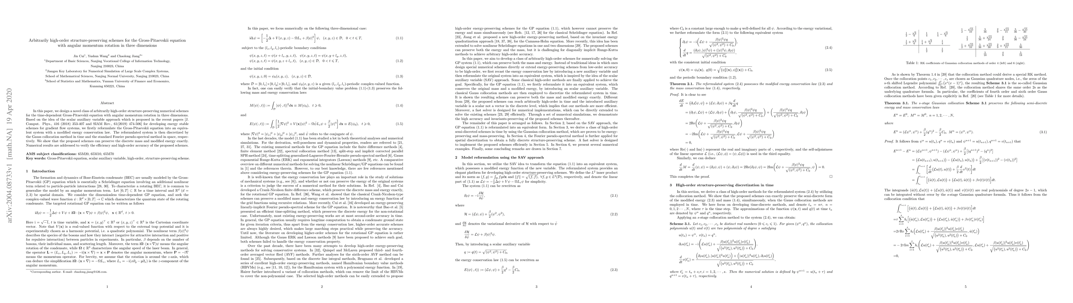 This paper introduces high-order structure-preserving schemes for the Gross-Pitaevskii equation with angular momentum rotation, reformulating it to maintain a modified energy conservation law. The schemes utilize the Gauss collocation method and Fourier pseudo-spectral method, demonstrating exact preservation of mass and modified energy, and high-order accuracy.