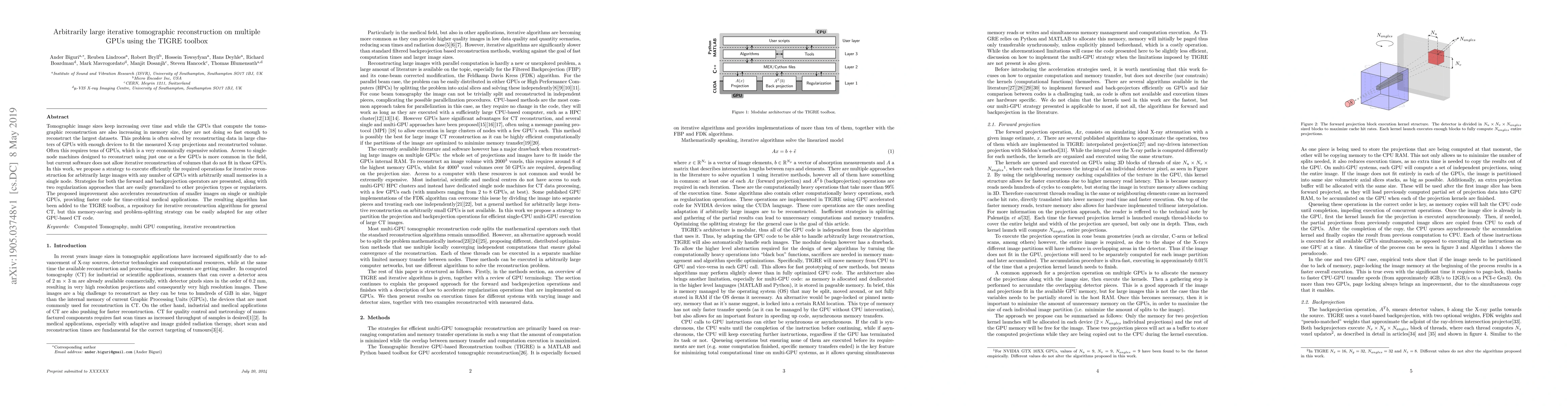 This paper proposes an efficient strategy for iterative tomographic reconstruction on multiple GPUs using the TIGRE toolbox, enabling the reconstruction of arbitrarily large images on single-node machines with limited GPU memory. The approach optimizes both forward and backprojection operations and introduces two regularization methods, enhancing reconstruction speed for both large and small datasets.
