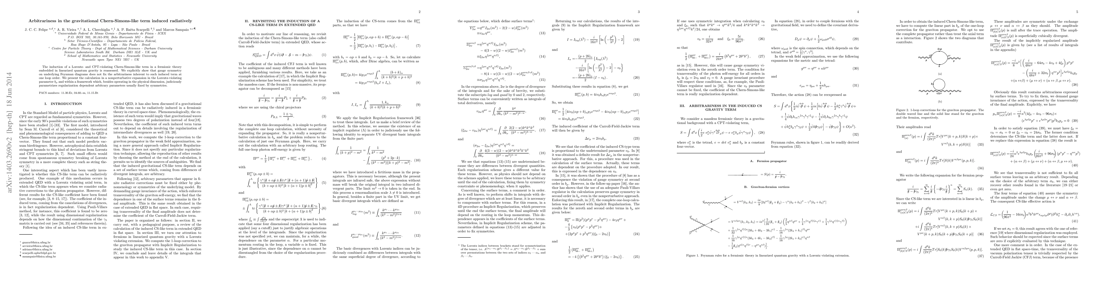 Lorentz violation through a radiatively induced Chern-Simons-like term in a fermionic theory embedded in linearized quantum gravity with a Lorentz- and CPT-violating axial-vector term in the fermionic sector proportional to a constant field $b_\mu$ has been recently studied. In a similar fashion as for the extended-QED model of Carroll-Field-Jackiw, we explicitly show that neither gauge invariance nor the more stringent momentum routing invariance condition on underlying Feynman diagrams fix the arbitrariness inherent to such induced term at one loop order. We present the calculation in a nonperturbative expansion in $b_\mu$ and within a framework which besides operating in the physical dimension (and thus avoiding $\gamma_5$ matrix Clifford algebra ambiguities), judiciously parametrizes regularization dependent arbitrary parameters usually fixed by symmetries.