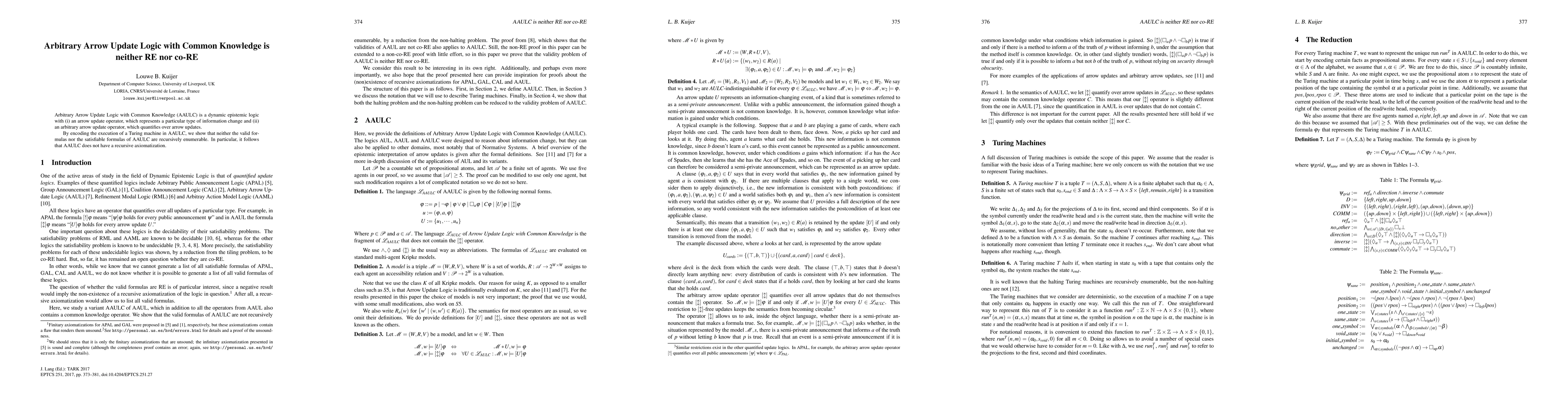 Arbitrary Arrow Update Logic with Common Knowledge (AAULC) is a dynamic epistemic logic with (i) an arrow update operator, which represents a particular type of information change and (ii) an arbitrary arrow update operator, which quantifies over arrow updates. By encoding the execution of a Turing machine in AAULC, we show that neither the valid formulas nor the satisfiable formulas of AAULC are recursively enumerable. In particular, it follows that AAULC does not have a recursive axiomatization.