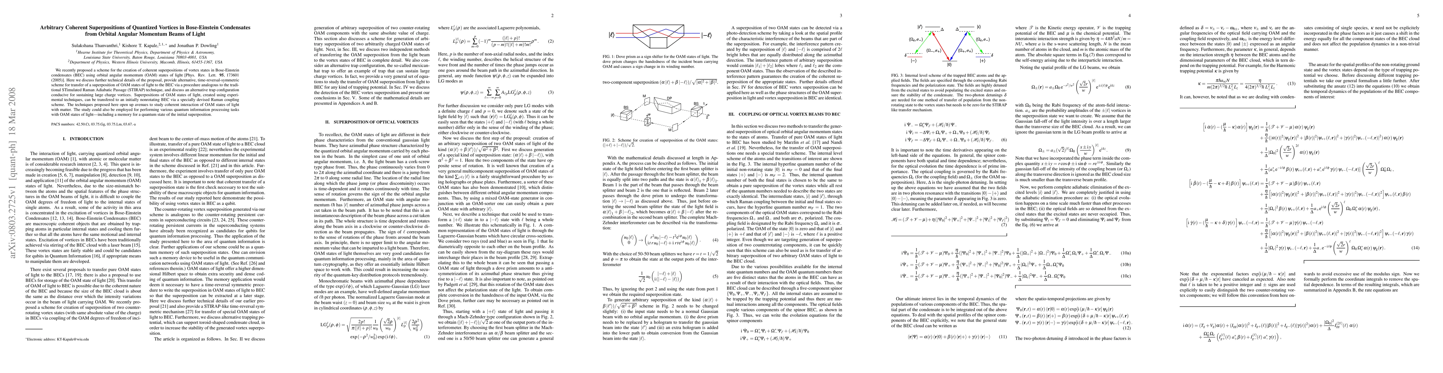 This paper details a method to create coherent superpositions of quantized vortices in Bose-Einstein condensates using orbital angular momentum states of light, employing a time-reversal-symmetric STIRAP technique and an alternative trap configuration. The proposed techniques enable the study of light-matter interactions and potential quantum information processing tasks.