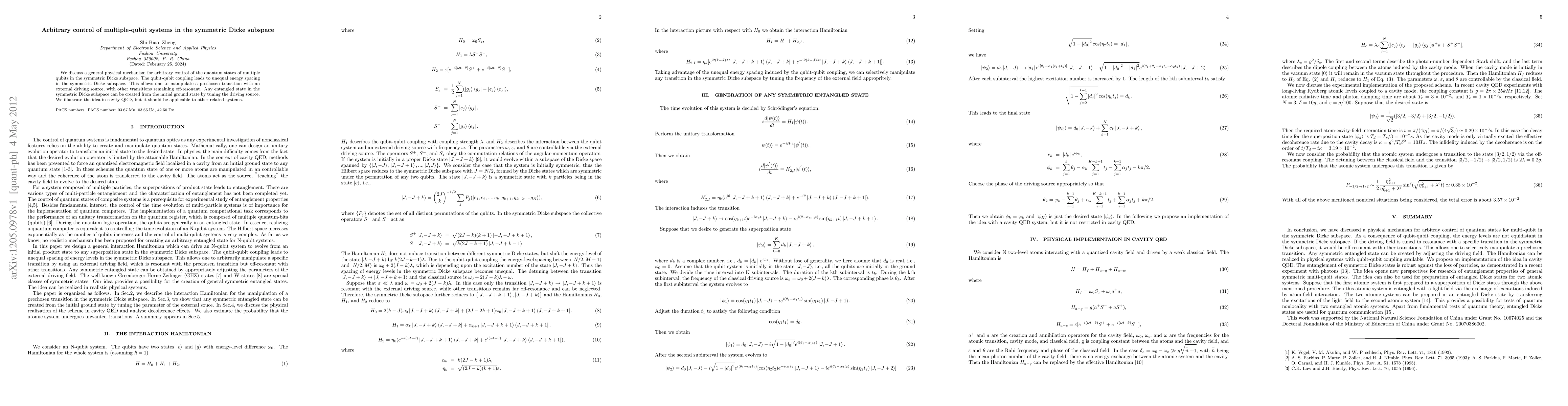 We discuss a general physical mechanism for arbitrary control of the quantum states of multiple qubits in the symmetric Dicke subspace. The qubit-qubit coupling leads to unequal energy spacing in the symmetric Dicke subspace. This allows one to manipulate a prechosen transition with an external driving source, with other transitions remaining off-resonant. Any entangled state in the symmetric Dicke subspace can be created from the initial ground state by tuning the driving source. We illustrate the idea in cavity QED, but it should be applicable to other related systems.