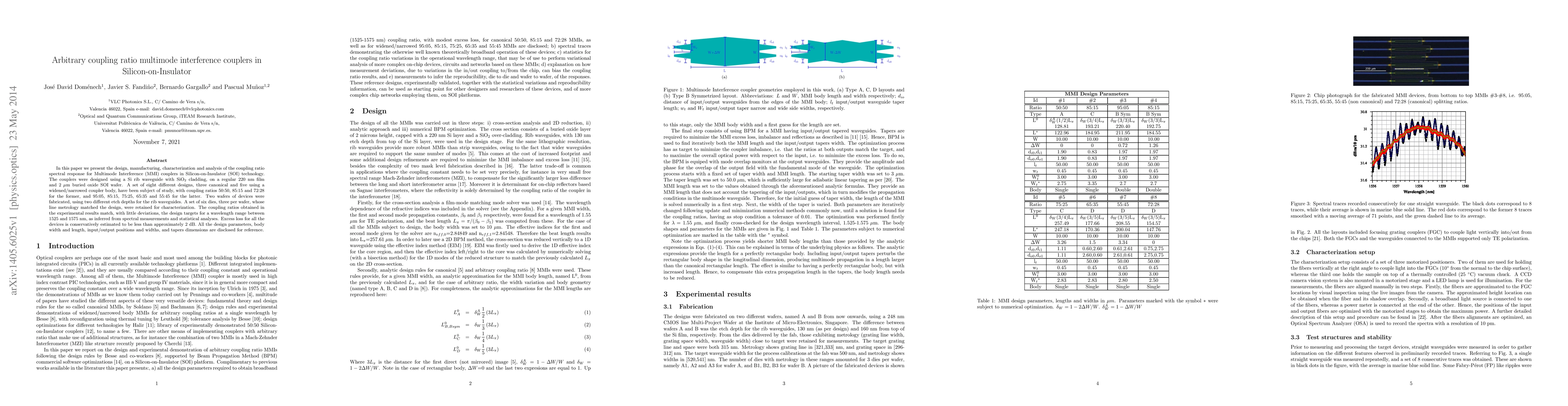 In this paper we present the design, manufacturing, characterization and analysis of the coupling ratio spectral response for Multimode Interference (MMI) couplers in Silicon-on-Insulator (SOI) technology. The couplers were designed using a Si rib waveguide with SiO 2 cladding, on a regular 220 nm film and 2 {\mu}m buried oxide SOI wafer. A set of eight different designs, three canonical and five using a widened/narrowed coupler body, have been subject of study, with coupling ratios 50:50, 85:15 and 72:28 for the former, and 95:05, 85:15, 75:25, 65:35 and 55:45 for the latter. Two wafers of devices were fabricated, using two different etch depths for the rib waveguides. A set of six dies, three per wafer, whose line metrology matched the design, were retained for characterization. The coupling ratios obtained in the experimental results match, with little deviations, the design targets for a wavelength range between 1525 and 1575 nm, as inferred from spectral measurements and statistical analyses. Excess loss for all the devices is conservatively estimated to be less than approximately 2 dB. All the design parameters, body width and length, input/output positions and widths, and tapers dimensions are disclosed for reference.