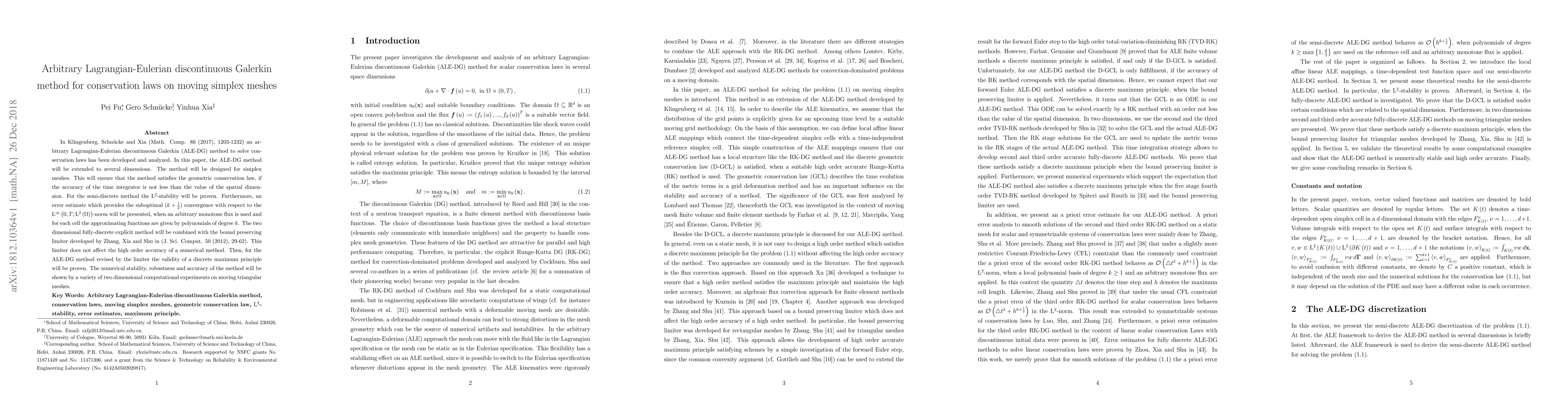 In Klingenberg, Schn\"ucke and Xia (Math. Comp. 86 (2017), 1203-1232) an arbitrary Lagrangian-Eulerian discontinuous Galerkin (ALE-DG) method to solve conservation laws has been developed and analyzed. In this paper, the ALE-DG method will be extended to several dimensions. The method will be designed for simplex meshes. This will ensure that the method satisfies the geometric conservation law, if the accuracy of the time integrator is not less than the value of the spatial dimension. For the semi-discrete method the L2-stability will be proven. Furthermore, an error estimate which provides the suboptimal (k+1/2) convergence with respect to the L-infinity-norm will be presented, when an arbitrary monotone flux is used and for each cell the approximating functions are given by polynomials of degree $k$. The two dimensional fully-discrete explicit method will be combined with the bound preserving limiter developed by Zhang, Xia and Shu in (J. Sci. Comput. 50 (2012), 29-62). This limiter does not affect the high order accuracy of a numerical method. Then, for the ALE-DG method revised by the limiter the validity of a discrete maximum principle will be proven. The numerical stability, robustness and accuracy of the method will be shown by a variety of two dimensional computational experiments on moving triangular meshes.