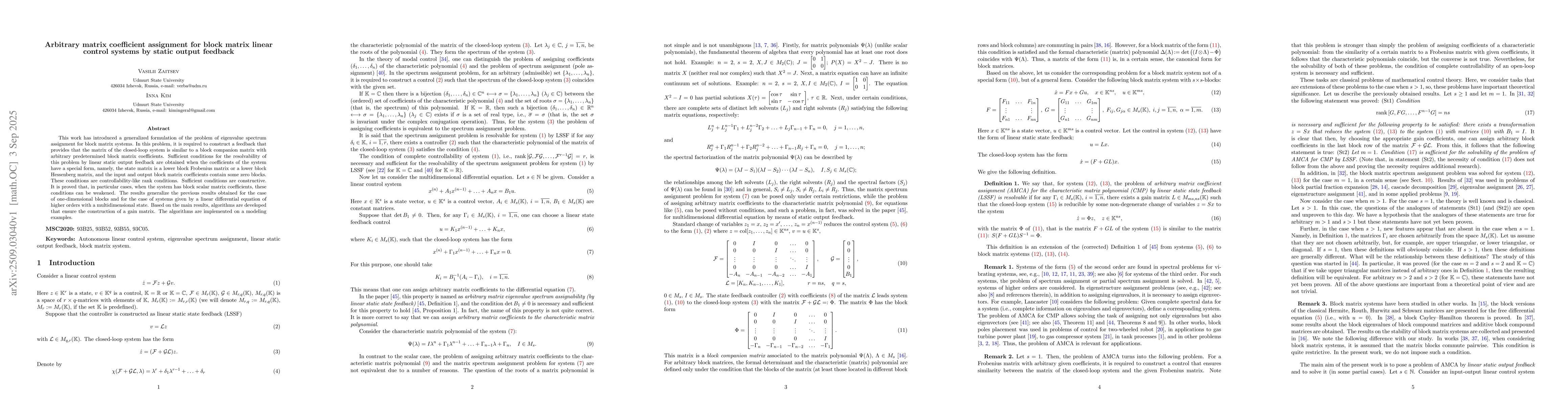 This work has introduced a generalized formulation of the problem of eigenvalue spectrum assignment for block matrix systems. In this problem, it is required to construct a feedback that provides that the matrix of the closed-loop system is similar to a block companion matrix with arbitrary predetermined block matrix coefficients. Sufficient conditions for the resolvability of this problem by linear static output feedback are obtained when the coefficients of the system have a special form, namely, the state matrix is a lower block Frobenius matrix or a lower block Hessenberg matrix, and the input and output block matrix coefficients contain some zero blocks. These conditions are controllability-like rank conditions. Sufficient conditions are constructive. It is proved that, in particular cases, when the system has block scalar matrix coefficients, these conditions can be weakened. The results generalize the previous results obtained for the case of one-dimensional blocks and for the case of systems given by a linear differential equation of higher orders with a multidimensional state. Based on the main results, algorithms are developed that ensure the construction of a gain matrix. The algorithms are implemented on a modeling examples.