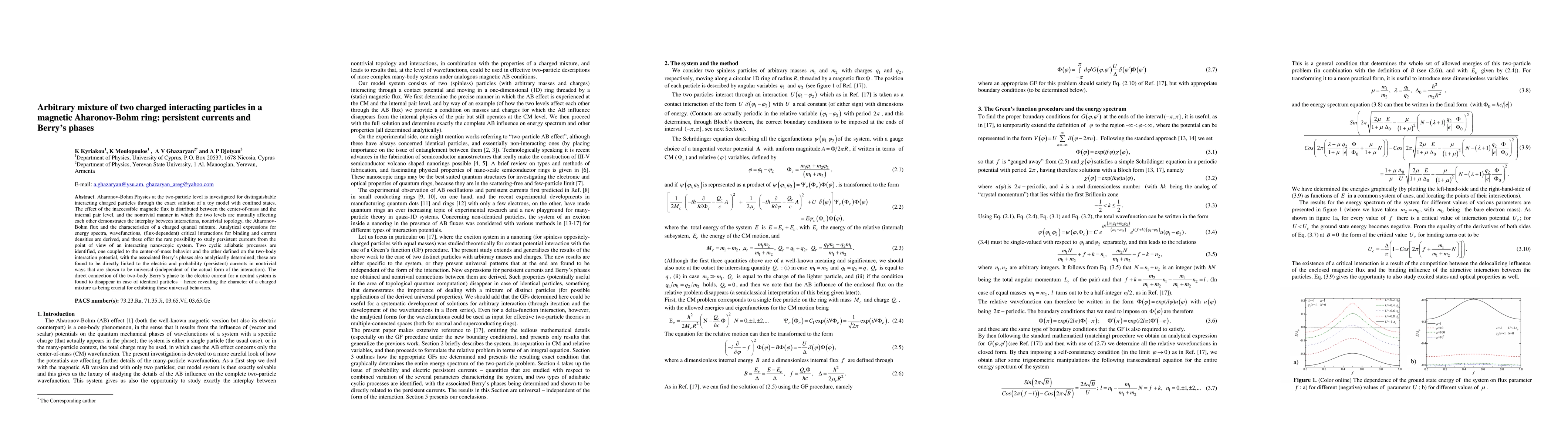 This paper investigates the Aharonov-Bohm effect in a system of two interacting charged particles confined in a ring, deriving analytical expressions for energy spectra and wavefunctions. It reveals the interplay between interactions, topology, and magnetic flux, showing how Berry's phases relate to persistent currents and electric currents, with unique behaviors emerging for charged mixtures.