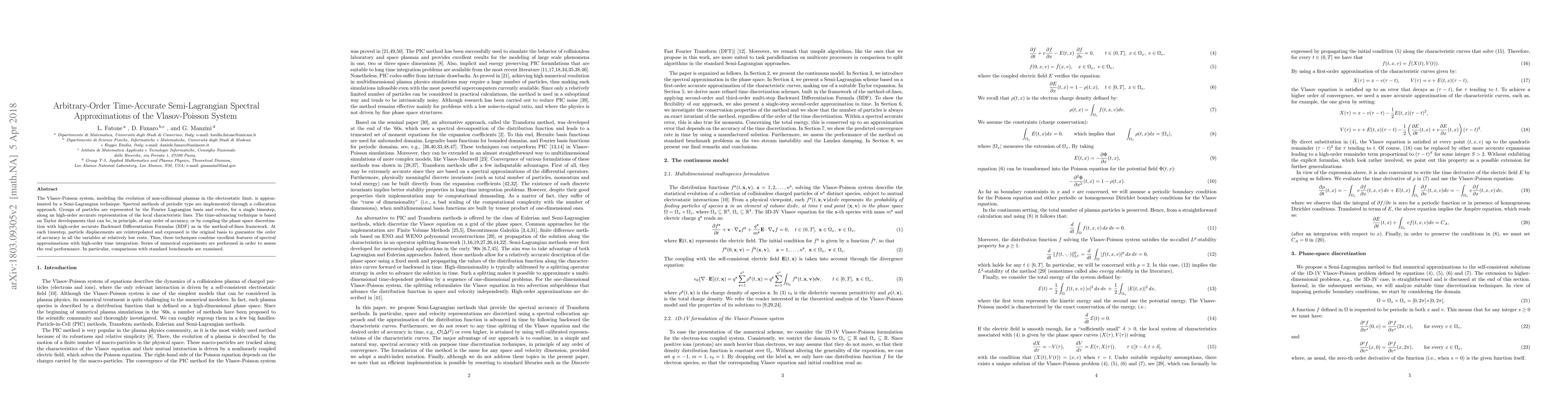 The Vlasov-Poisson system, modeling the evolution of non-collisional plasmas in the electrostatic limit, is approx- imated by a Semi-Lagrangian technique. Spectral methods of periodic type are implemented through a collocation approach. Groups of particles are represented by the Fourier Lagrangian basis and evolve, for a single timestep, along an high-order accurate representation of the local characteristic lines. The time-advancing technique is based on Taylor developments that can be, in principle, of any order of accuracy, or by coupling the phase space discretiza- tion with high-order accurate Backward Differentiation Formulas (BDF) as in the method-of-lines framework. At each timestep, particle displacements are reinterpolated and expressed in the original basis to guarantee the order of accuracy in all the variables at relatively low costs. Thus, these techniques combine excellent features of spectral approximations with high-order time integration. Series of numerical experiments are performed in order to assess the real performance. In particular, comparisons with standard benchmarks are examined.
