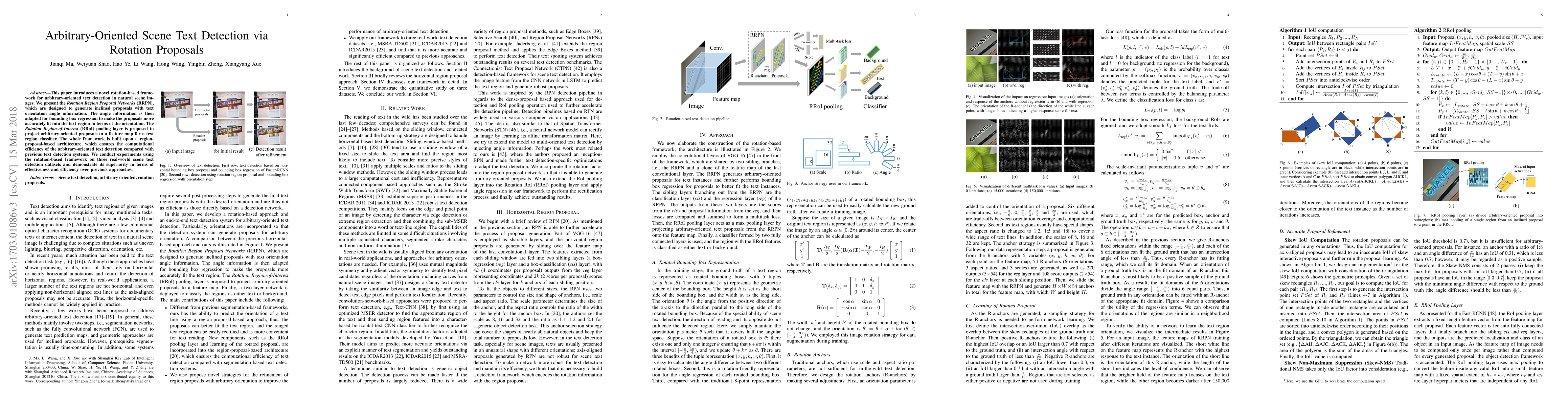 This paper proposes a Rotation Region Proposal Network (RRPN) for detecting arbitrarily oriented text in natural scene images, generating inclined proposals with orientation angle information for precise bounding box regression. The Rotation Region-of-Interest pooling layer enhances the feature map for text region classification, achieving superior effectiveness and efficiency over previous methods.