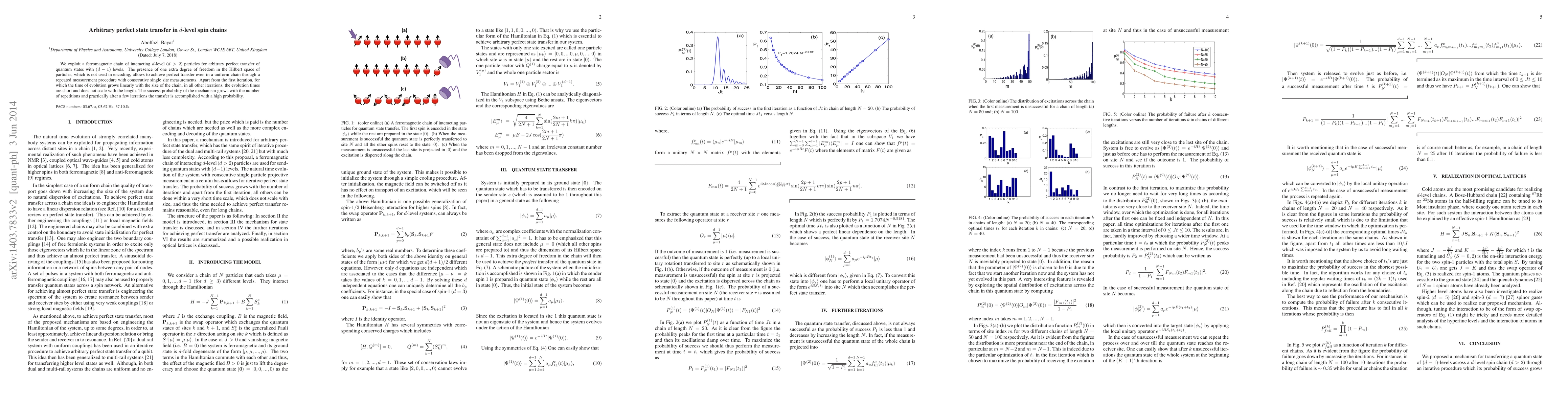 We exploit a ferromagnetic chain of interacting $d$-level ($d>2$) particles for arbitrary perfect transfer of quantum states with $(d-1)$ levels. The presence of one extra degree of freedom in the Hilbert space of particles, which is not used in encoding, allows to achieve perfect transfer even in a uniform chain through a repeated measurement procedure with consecutive single site measurements. Apart from the first iteration, for which the time of evolution grows linearly with the size of the chain, in all other iterations, the evolution times are short and does not scale with the length. The success probability of the mechanism grows with the number of repetitions and practically after a few iterations the transfer is accomplished with a high probability.