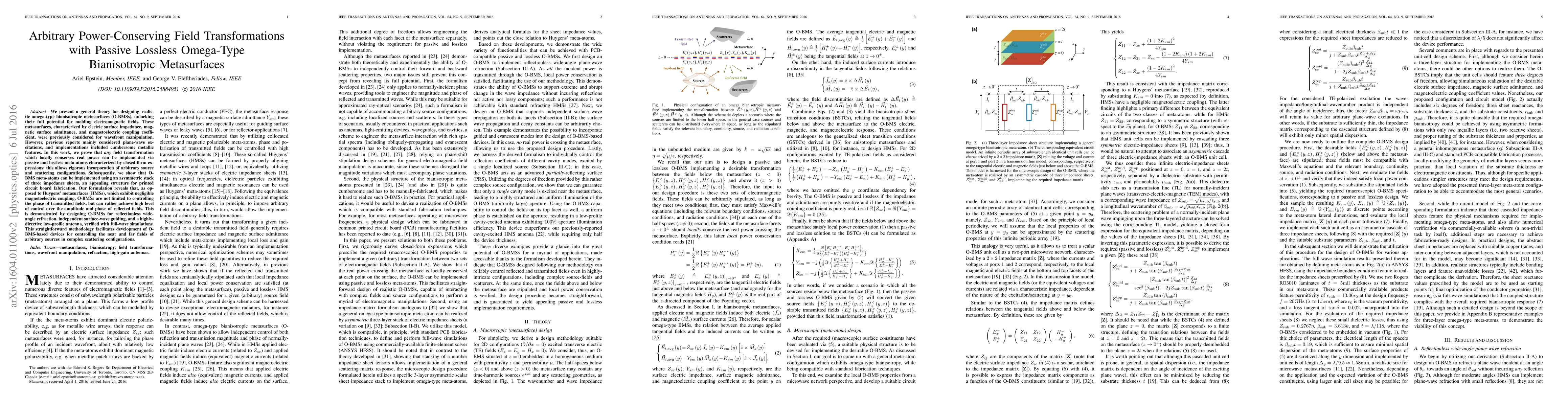 This paper presents a theory for designing omega-type bianisotropic metasurfaces (O-BMSs) that enable arbitrary power-conserving field transformations without losses, using passive meta-atoms. Unlike Huygens' metasurfaces, O-BMSs provide significant magnetoelectric coupling, allowing control over both amplitude and phase of reflected fields, demonstrated through applications like wide-angle refraction and low-profile antennas.