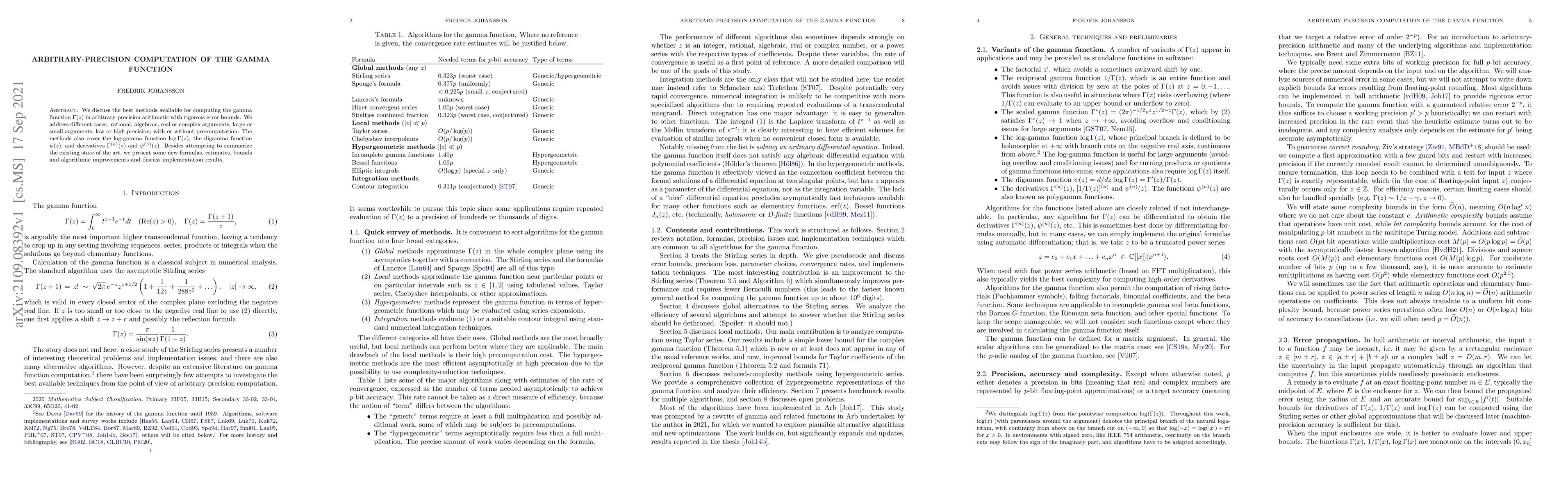 The paper discusses methods for computing the gamma function in arbitrary-precision arithmetic with rigorous error bounds, including new formulas and algorithmic improvements.