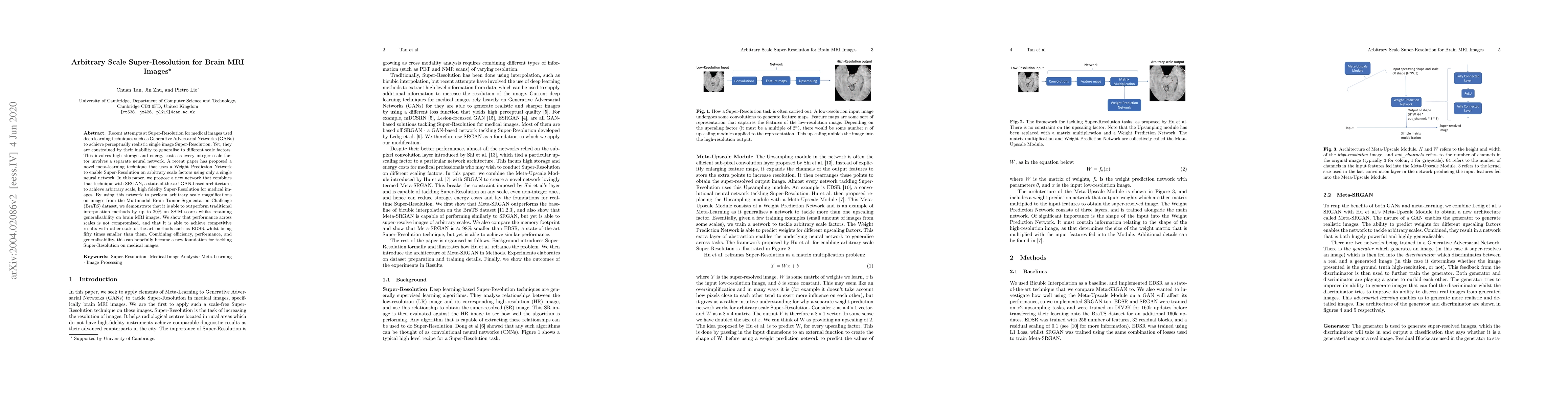 This paper proposes a novel network combining a meta-learning technique with SRGAN for arbitrary scale Super-Resolution of brain MRI images, achieving up to 20% better SSIM scores compared to traditional methods while maintaining efficiency and generalisability. The method outperforms other state-of-the-art techniques and is significantly smaller in size.