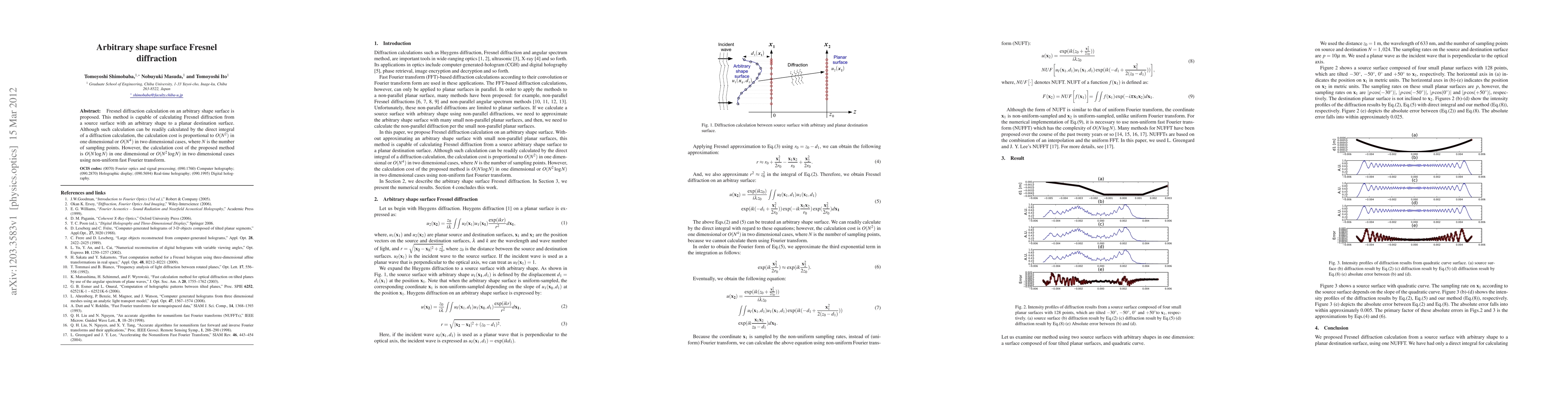The paper proposes a method for efficiently calculating Fresnel diffraction from an arbitrary shape source to a planar destination surface, significantly reducing computational cost from $O(N^2)$ or $O(N^4)$ to $O(N \log N)$ or $O(N^2 \log N)$ using non-uniform fast Fourier transform.