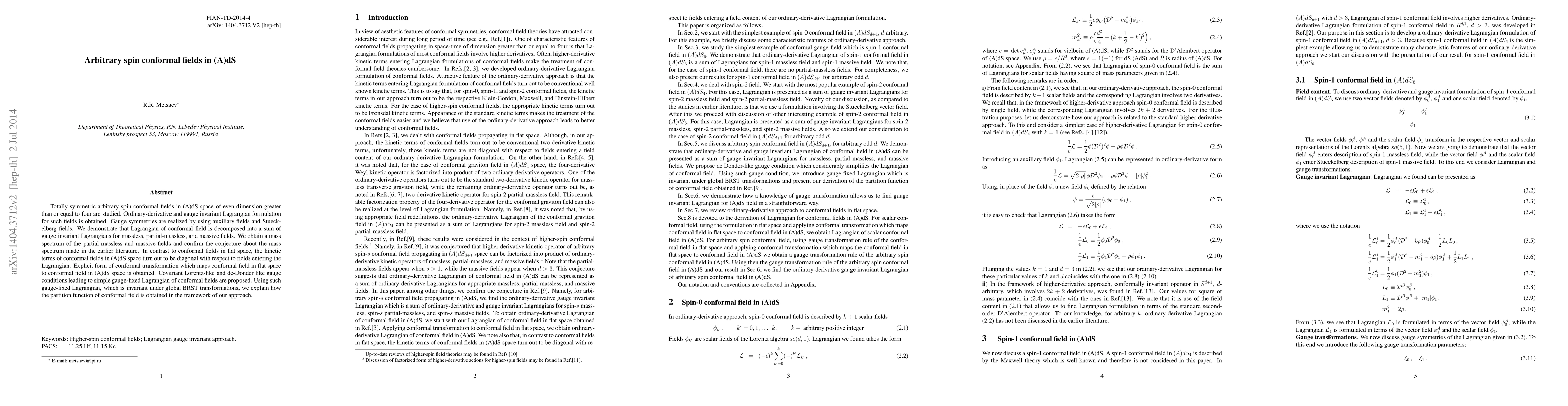 Researchers studied totally symmetric arbitrary spin conformal fields in anti-de Sitter (AdS) space, developing a gauge invariant Lagrangian formulation and demonstrating its implications on the mass spectrum of massive and partial-massless fields.