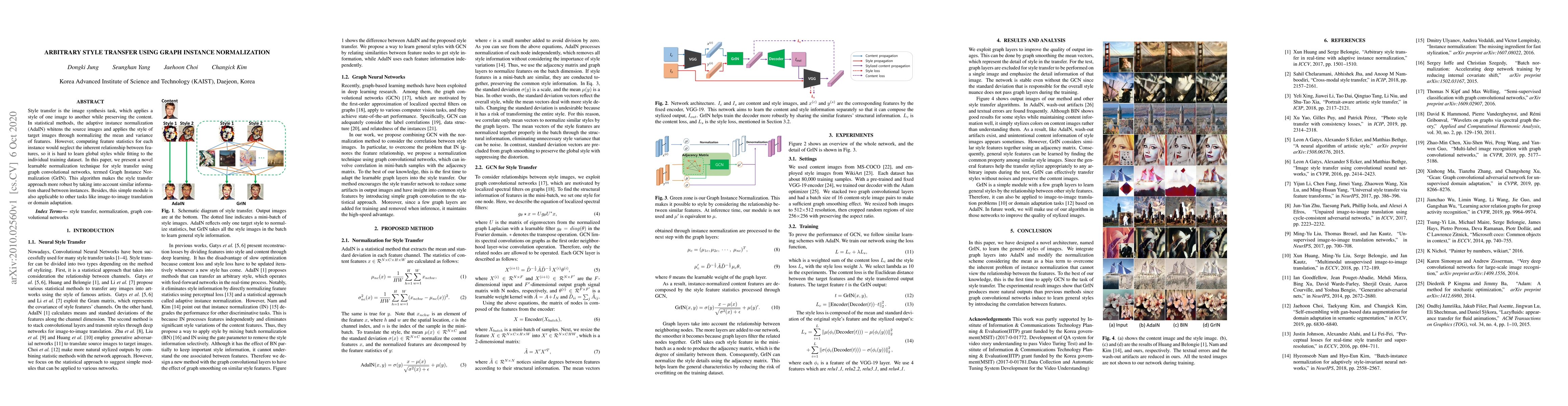 Style transfer is the image synthesis task, which applies a style of one image to another while preserving the content. In statistical methods, the adaptive instance normalization (AdaIN) whitens the source images and applies the style of target images through normalizing the mean and variance of features. However, computing feature statistics for each instance would neglect the inherent relationship between features, so it is hard to learn global styles while fitting to the individual training dataset. In this paper, we present a novel learnable normalization technique for style transfer using graph convolutional networks, termed Graph Instance Normalization (GrIN). This algorithm makes the style transfer approach more robust by taking into account similar information shared between instances. Besides, this simple module is also applicable to other tasks like image-to-image translation or domain adaptation.