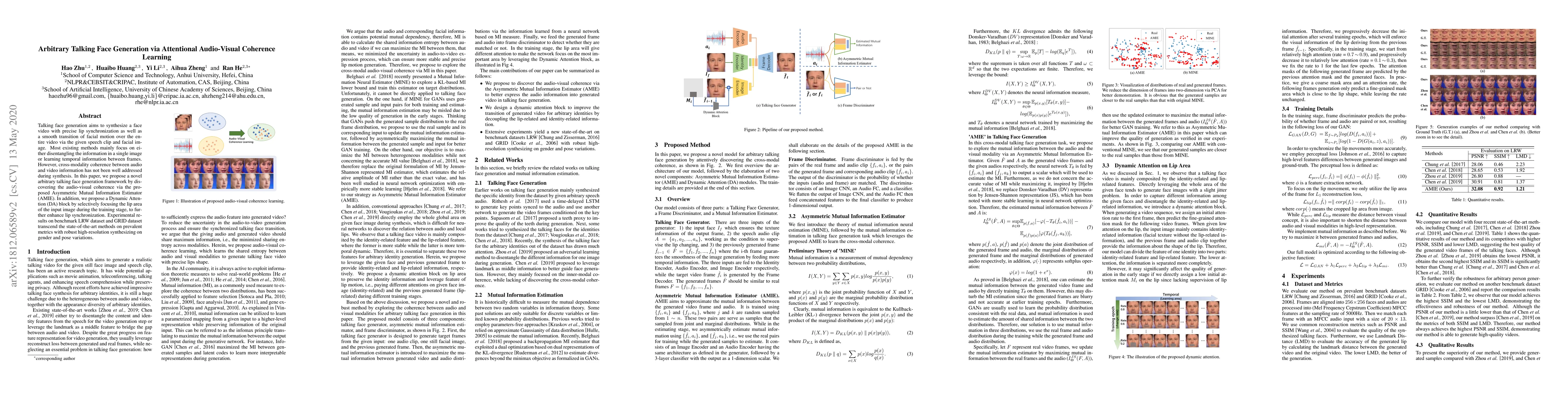Talking face generation aims to synthesize a face video with precise lip synchronization as well as a smooth transition of facial motion over the entire video via the given speech clip and facial image. Most existing methods mainly focus on either disentangling the information in a single image or learning temporal information between frames. However, cross-modality coherence between audio and video information has not been well addressed during synthesis. In this paper, we propose a novel arbitrary talking face generation framework by discovering the audio-visual coherence via the proposed Asymmetric Mutual Information Estimator (AMIE). In addition, we propose a Dynamic Attention (DA) block by selectively focusing the lip area of the input image during the training stage, to further enhance lip synchronization. Experimental results on benchmark LRW dataset and GRID dataset transcend the state-of-the-art methods on prevalent metrics with robust high-resolution synthesizing on gender and pose variations.