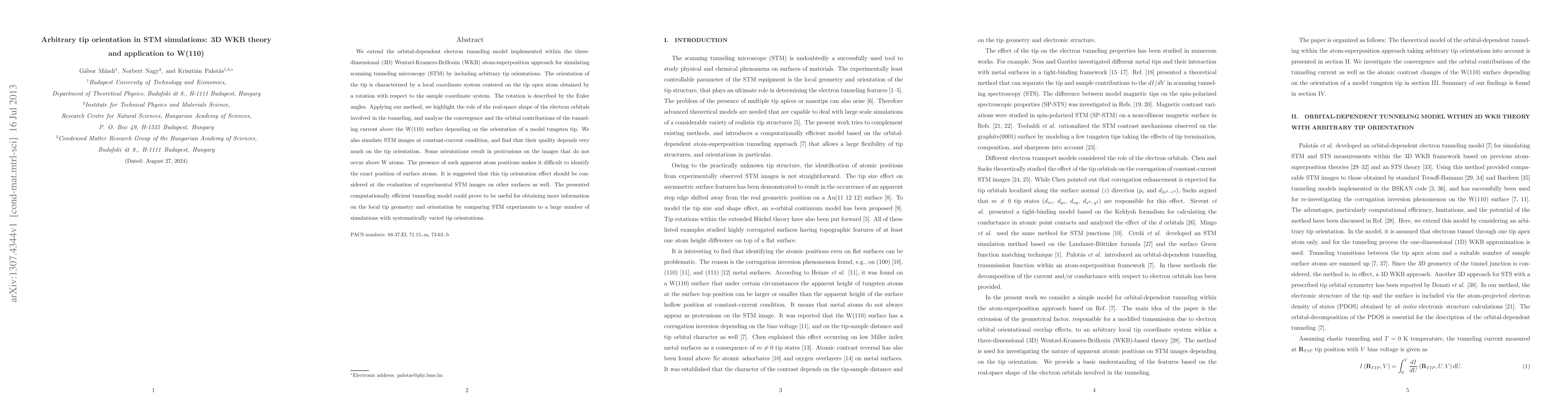 We extend the orbital-dependent electron tunneling model implemented within the three-dimensional (3D) Wentzel-Kramers-Brillouin (WKB) atom-superposition approach for simulating scanning tunneling microscopy (STM) by including arbitrary tip orientations. The orientation of the tip is characterized by a local coordinate system centered on the tip apex atom obtained by a rotation with respect to the sample coordinate system. The rotation is described by the Euler angles. Applying our method, we highlight the role of the real-space shape of the electron orbitals involved in the tunneling, and analyze the convergence and the orbital contributions of the tunneling current above the W(110) surface depending on the orientation of a model tungsten tip. We also simulate STM images at constant-current condition, and find that their quality depends very much on the tip orientation. Some orientations result in protrusions on the images that do not occur above W atoms. The presence of such apparent atom positions makes it difficult to identify the exact position of surface atoms. It is suggested that this tip orientation effect should be considered at the evaluation of experimental STM images on other surfaces as well. The presented computationally efficient tunneling model could prove to be useful for obtaining more information on the local tip geometry and orientation by comparing STM experiments to a large number of simulations with systematically varied tip orientations.