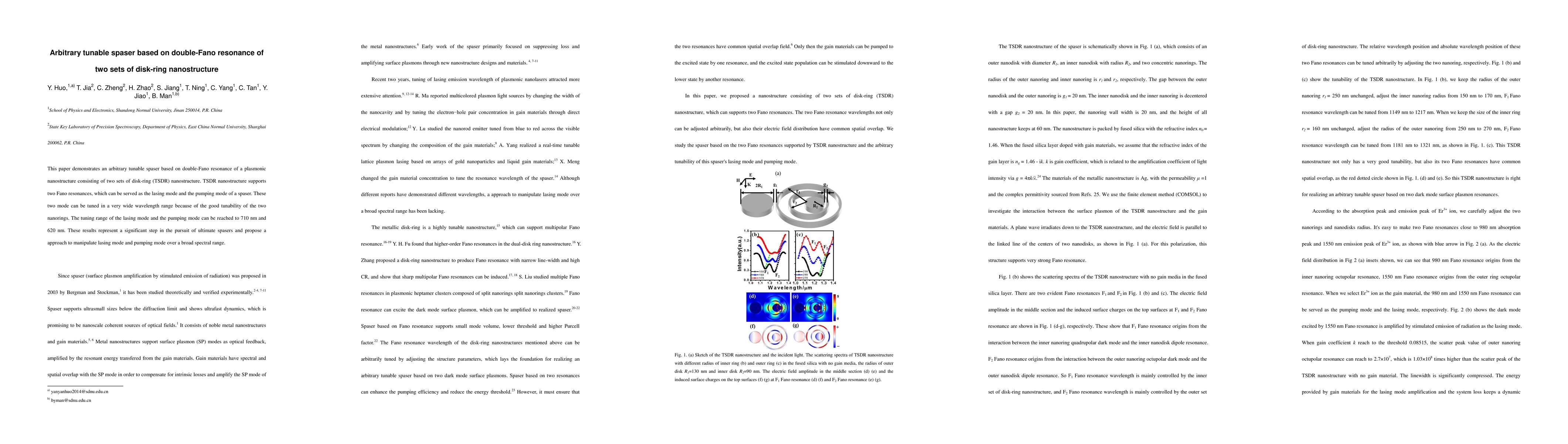 This paper demonstrates an arbitrary tunable spaser based on double-Fano resonance of a plasmonic nanostructure consisting of two sets of disk-ring (TSDR) nanostructure. TSDR nanostructure supports two Fano resonances, which can be served as the lasing mode and the pumping mode of a spaser. These two mode can be tuned in a very wide wavelength range because of the good tunability of the two nanorings. The tuning range of the lasing mode and the pumping mode can be reached to 710 nm and 620 nm. These results represent a significant step in the pursuit of ultimate spasers and propose a approach to manipulate lasing mode and pumping mode over a broad spectral range.