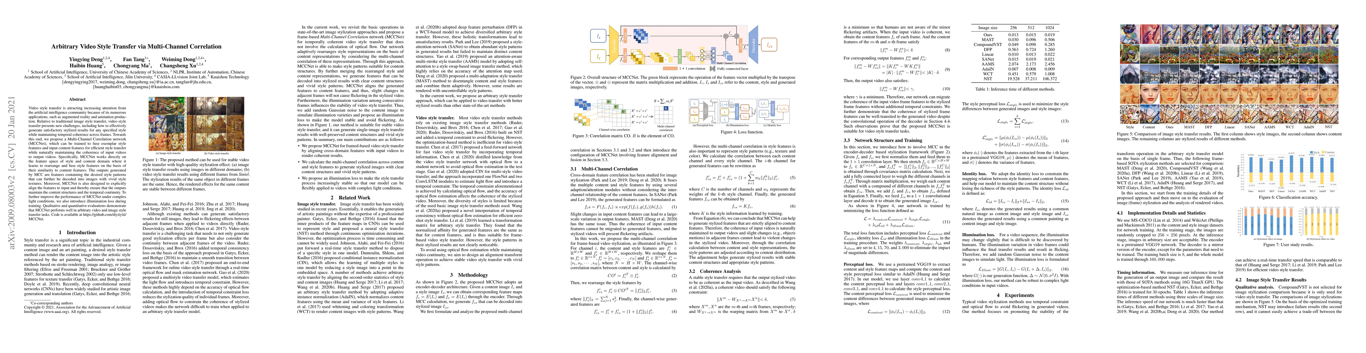 This paper proposes the Multi-Channel Correction network (MCCNet) for efficient and coherent arbitrary video style transfer, addressing the challenge of maintaining temporal continuity across frames. MCCNet learns to fuse style and content features in the feature space, ensuring both style preservation and temporal coherence, enhanced by an illumination loss for complex lighting conditions.
