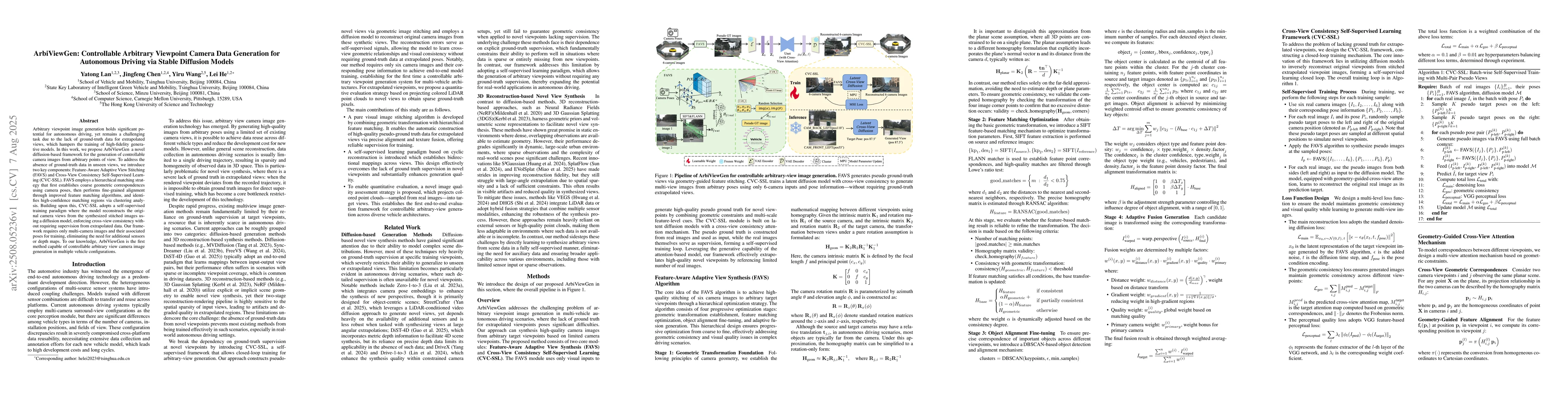 Arbitrary viewpoint image generation holds significant potential for autonomous driving, yet remains a challenging task due to the lack of ground-truth data for extrapolated views, which hampers the training of high-fidelity generative models. In this work, we propose Arbiviewgen, a novel diffusion-based framework for the generation of controllable camera images from arbitrary points of view. To address the absence of ground-truth data in unseen views, we introduce two key components: Feature-Aware Adaptive View Stitching (FAVS) and Cross-View Consistency Self-Supervised Learning (CVC-SSL). FAVS employs a hierarchical matching strategy that first establishes coarse geometric correspondences using camera poses, then performs fine-grained alignment through improved feature matching algorithms, and identifies high-confidence matching regions via clustering analysis. Building upon this, CVC-SSL adopts a self-supervised training paradigm where the model reconstructs the original camera views from the synthesized stitched images using a diffusion model, enforcing cross-view consistency without requiring supervision from extrapolated data. Our framework requires only multi-camera images and their associated poses for training, eliminating the need for additional sensors or depth maps. To our knowledge, Arbiviewgen is the first method capable of controllable arbitrary view camera image generation in multiple vehicle configurations.