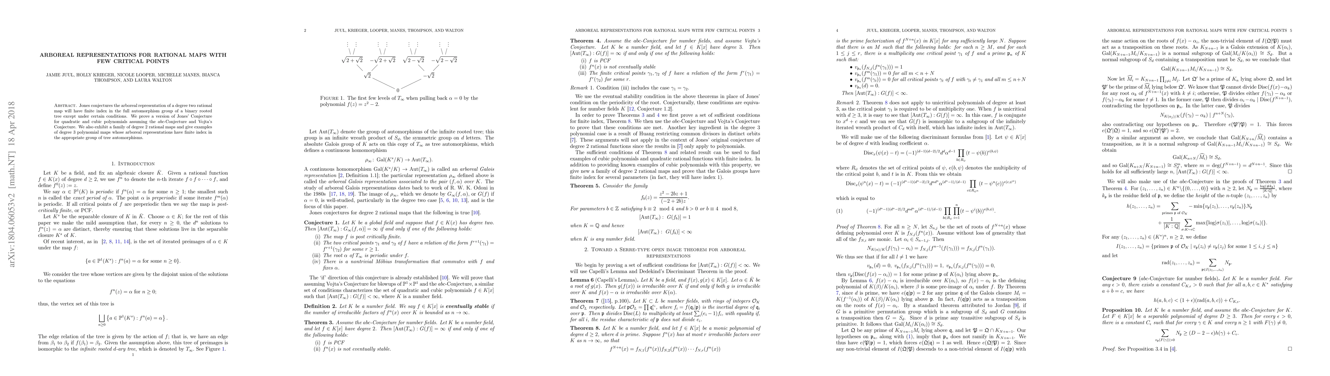 Jones conjectures the arboreal representation of a degree two rational map will have finite index in the full automorphism group of a binary rooted tree except under certain conditions. We prove a version of Jones' Conjecture for quadratic and cubic polynomials assuming the $abc$-Conjecture and Vojta's Conjecture. We also exhibit a family of degree $2$ rational maps and give examples of degree $3$ polynomial maps whose arboreal representations have finite index in the appropriate group of tree automorphisms.