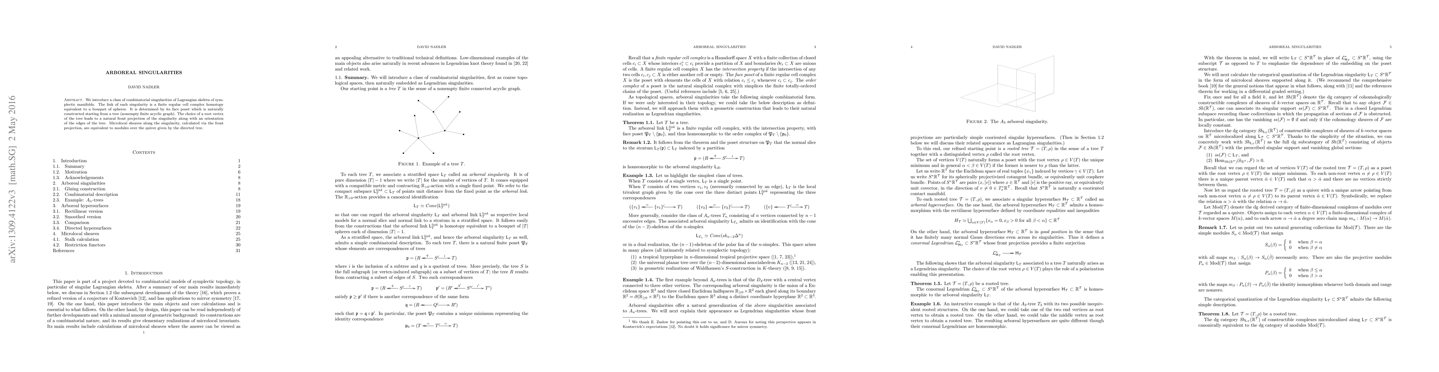 We introduce a class of combinatorial singularities of Lagrangian skeleta of symplectic manifolds. The link of each singularity is a finite regular cell complex homotopy equivalent to a bouquet of spheres. It is determined by its face poset which is naturally constructed starting from a tree (nonempty finite acyclic graph). The choice of a root vertex of the tree leads to a natural front projection of the singularity along with an orientation of the edges of the tree. Microlocal sheaves along the singularity, calculated via the front projection, are equivalent to modules over the quiver given by the directed tree.