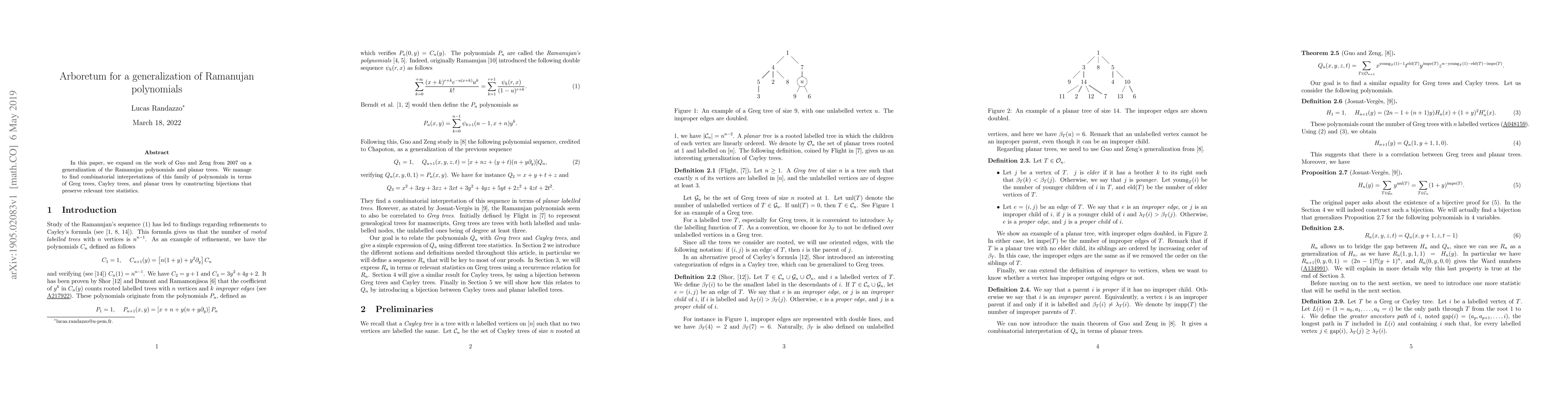 This paper generalizes Ramanujan polynomials and establishes combinatorial interpretations through bijections that connect them to Greg trees, Cayley trees, and planar trees, preserving key tree statistics. The work builds on the foundational research by Guo and Zeng in 2007.